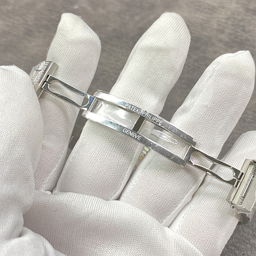 Integriertes Armband aus weißgoldfarbenem 904L-Edelstahl. Die Mittelglieder sind vollständig mit farblosen Zirkonia besetzt; die Außenglieder sind in satiniertem Weißgold gehalten. Die Diamantenrinne verläuft ununterbrochen von der Lünette durch das Armband. Faltschließe. Die komplett weiße Besatzfläche macht dieses Modell zum edelsten der Nautilus-Kollektion.