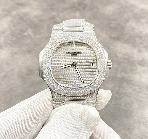 Replika Patek Philippe Nautilus 5719/10G — 40 mm Vollständig mit weißen Diamanten besetzt