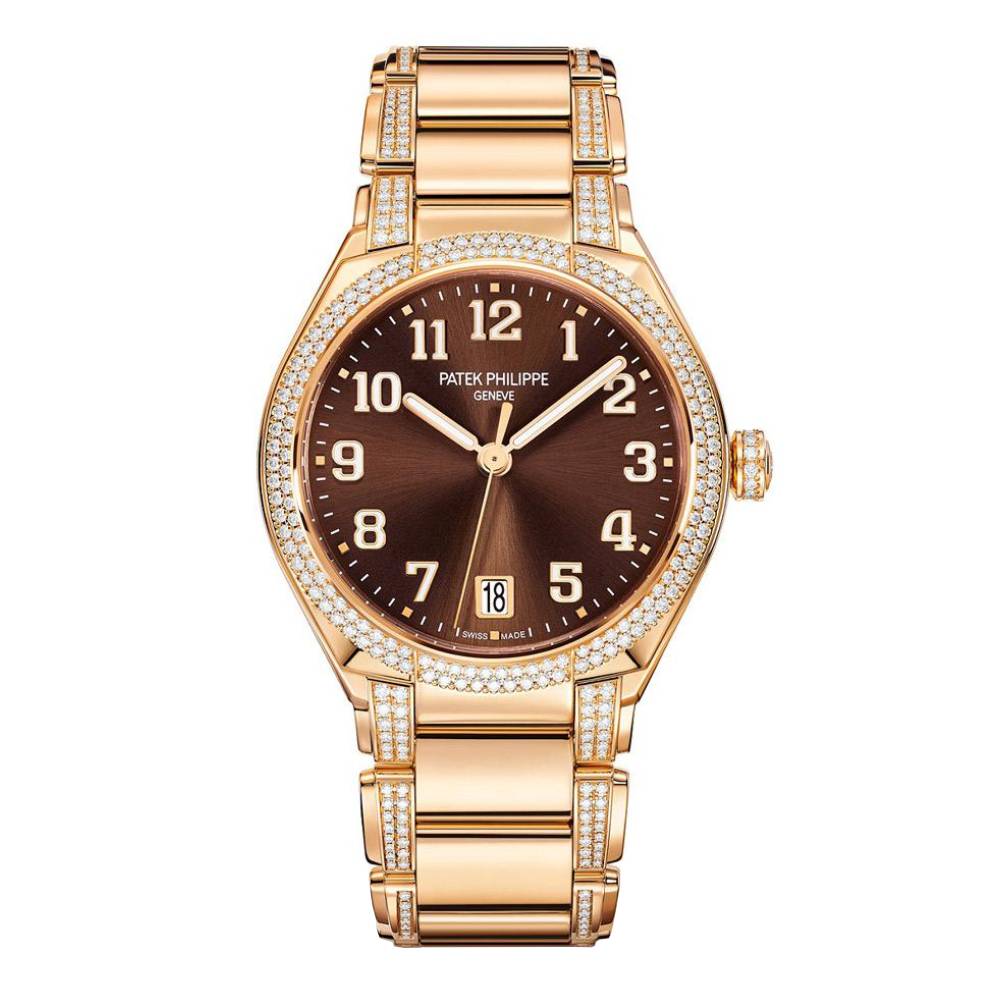 2018 veränderte sich die Uhrenwelt grundlegend, als Patek Philippe die Twenty-4 Automatic 7300/1200A vorstellte – ein rundes 36-mm-Gehäuse mit dem automatischen Kaliber 324 SC. Dies war ein klares Statement: Die Twenty-4 war nicht länger nur eine „Quarzuhr für Damen“. Sie war ein echtes uhrmacherisches Instrument mit einem echten Uhrwerk, erhältlich in Edelstahl mit einem wunderschönen grauen Sonnenschliff-Zifferblatt oder in Roségold mit einem olivgrünen Zifferblatt. Das Armband besticht durch dieselbe hochwertige Verarbeitung wie das der Nautilus – abwechselnd satinierte und polierte Oberflächen, die bei jeder Handgelenksbewegung das Licht auf unterschiedliche Weise reflektieren.