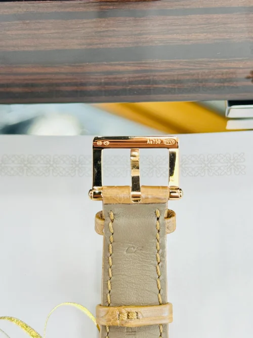 Bracelet en cuir d'alligator beige nacré mat, cousu main, avec boucle ardillon en or rose. La teinte beige est plus claire et plus féminine que le marron chocolat utilisé sur les modèles masculins. Souple et fin, il est conçu pour sublimer un poignet fin sans l'alourdir. Pour un autre modèle féminin, voir le Collection Twenty~4 avec son architecture dédiée aux femmes.