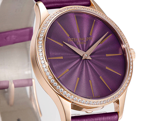 Quadrante viola in rilievo su oro rosa con lunetta di diamanti da 35 mm: il modello 4997/200R è il Calatrava Joaillerie nella sua versione più cromatica.