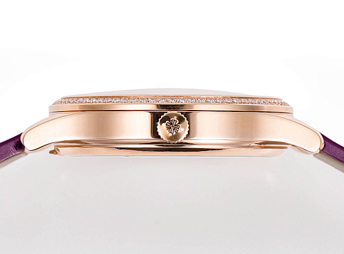 Diametro di 35 mm. Cassa in oro rosa con lunetta incastonata con diamanti taglio brillante. Anse sottili, adatte a polsi inferiori a 17 cm. Vetro zaffiro sul davanti, fondello pieno. Corona a ore tre. Oro rosa e diamanti creano una combinazione visiva più calda rispetto al modello in oro bianco 4997/200G, con il metallo rosa ramato che completa le calde tonalità viola.