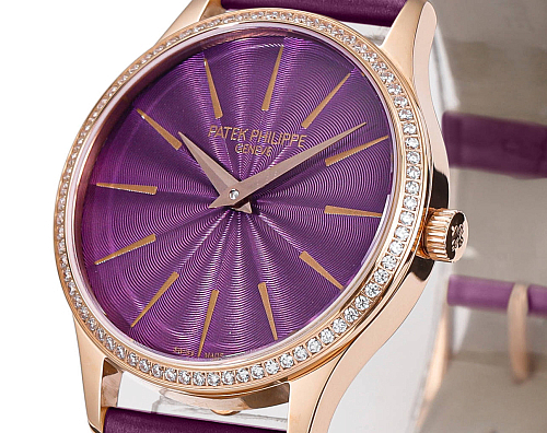 Il 4997/200R-001 è il Calatrava Joaillerie in oro rosa con quadrante viola in rilievo, una delle scelte cromatiche più audaci che Patek Philippe abbia mai offerto in una collezione femminile. Il suffisso R contraddistingue l'oro rosa, mentre il codice di riferimento "200" indica la lunetta con diamanti. Lacca viola su motivo in rilievo, cassa da 35 mm, movimento automatico. Questa replica del Patek Philippe Calatrava 4997R è realizzata in oro rosa: cassa, lunetta con diamanti, corona.
