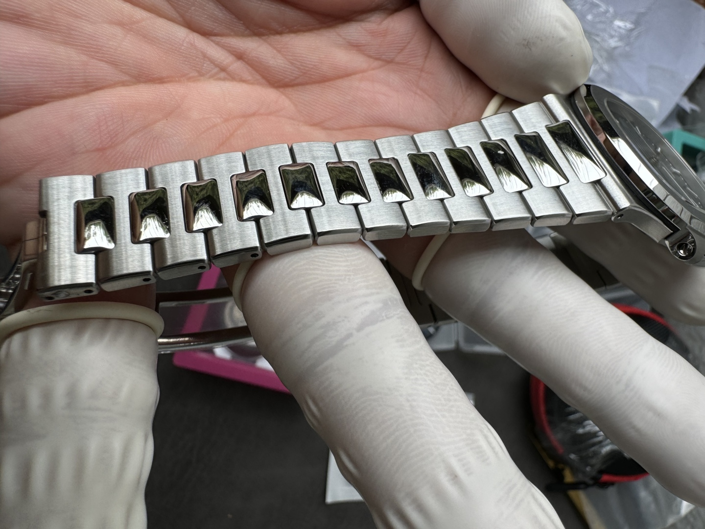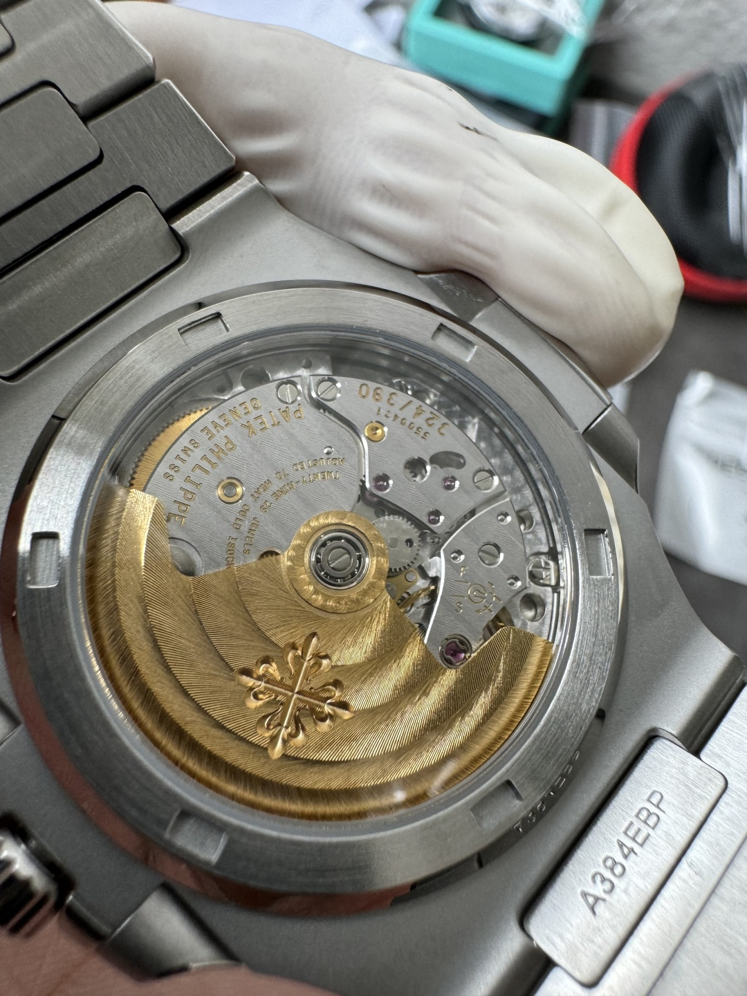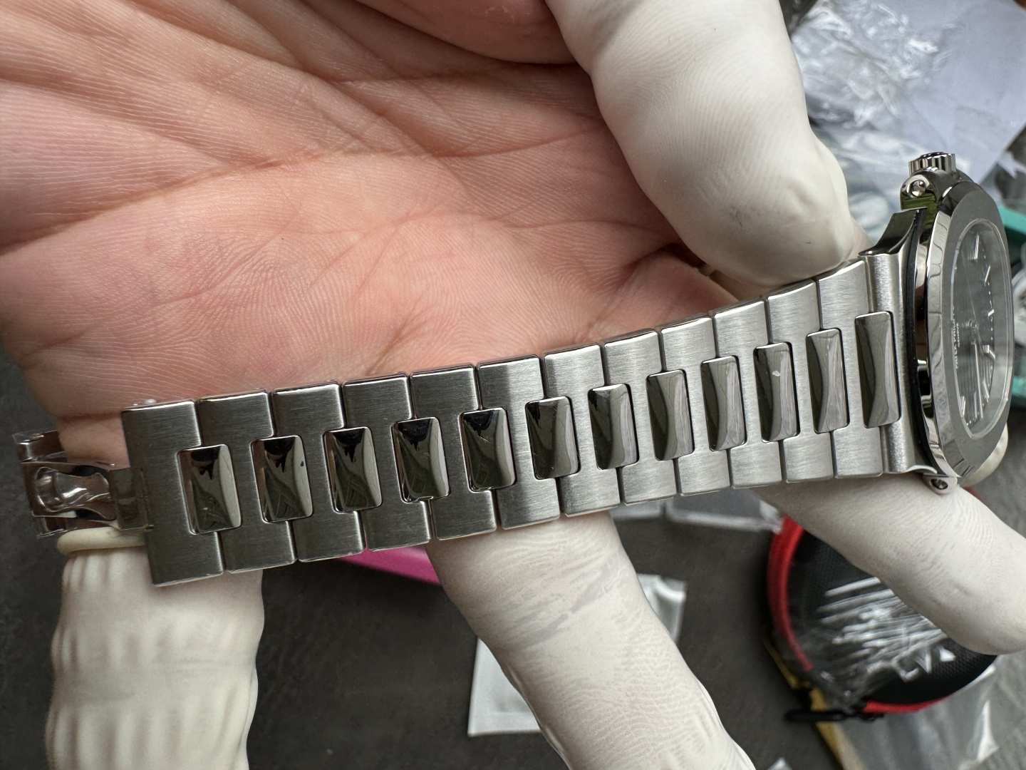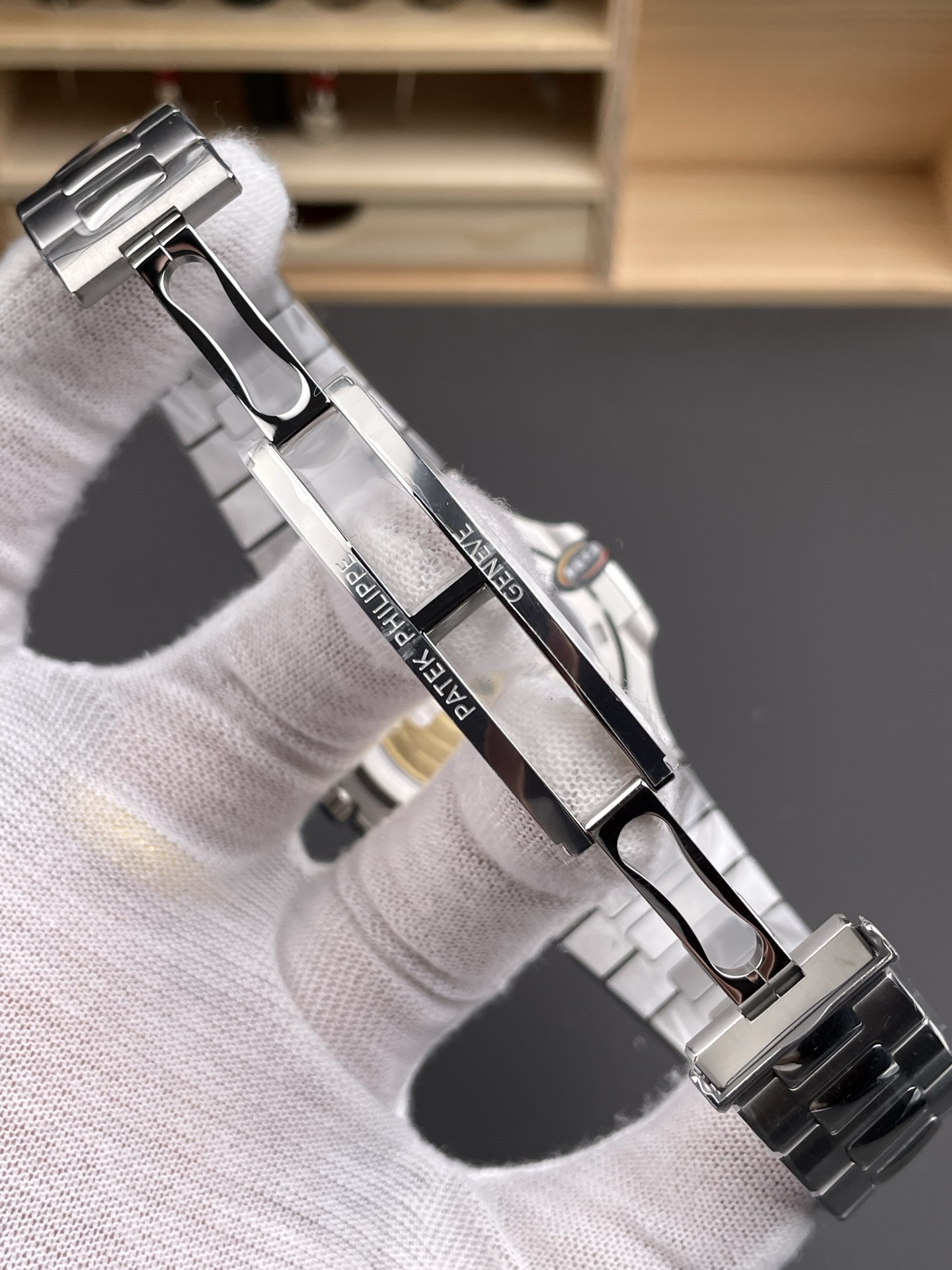 Integrated 904L, flush at the first link — no gap between case and bracelet. This joint is the single most scrutinized detail on any Nautilus build. Graduating links to a fold-over deployment clasp, alternating satin and polished. Balanced weight, sits flat on the wrist. The Aquanaut runs the same movement on rubber — lighter, sportier, but it’s not this.Movement