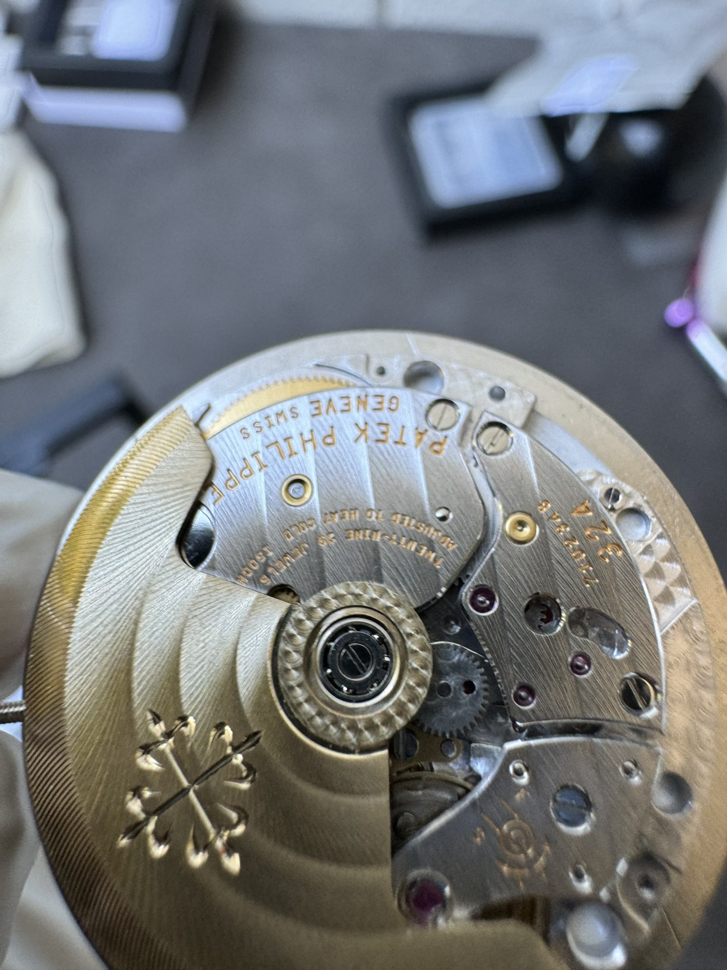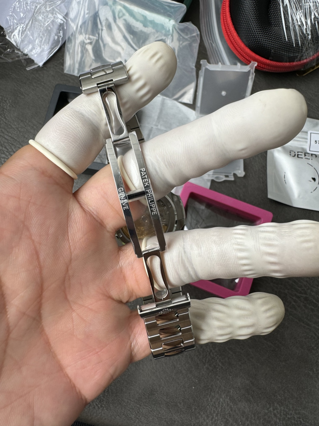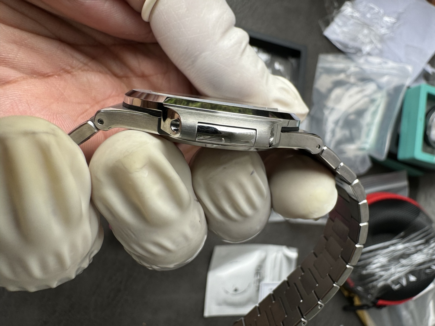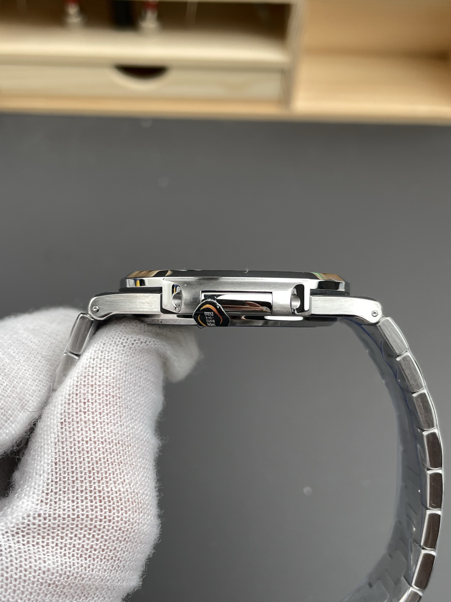 Integrated 904L, flush at the first link — no gap between case and bracelet. This joint is the single most scrutinized detail on any Nautilus build. Graduating links to a fold-over deployment clasp, alternating satin and polished. Balanced weight, sits flat on the wrist. The Aquanaut runs the same movement on rubber — lighter, sportier, but it’s not this.Movement