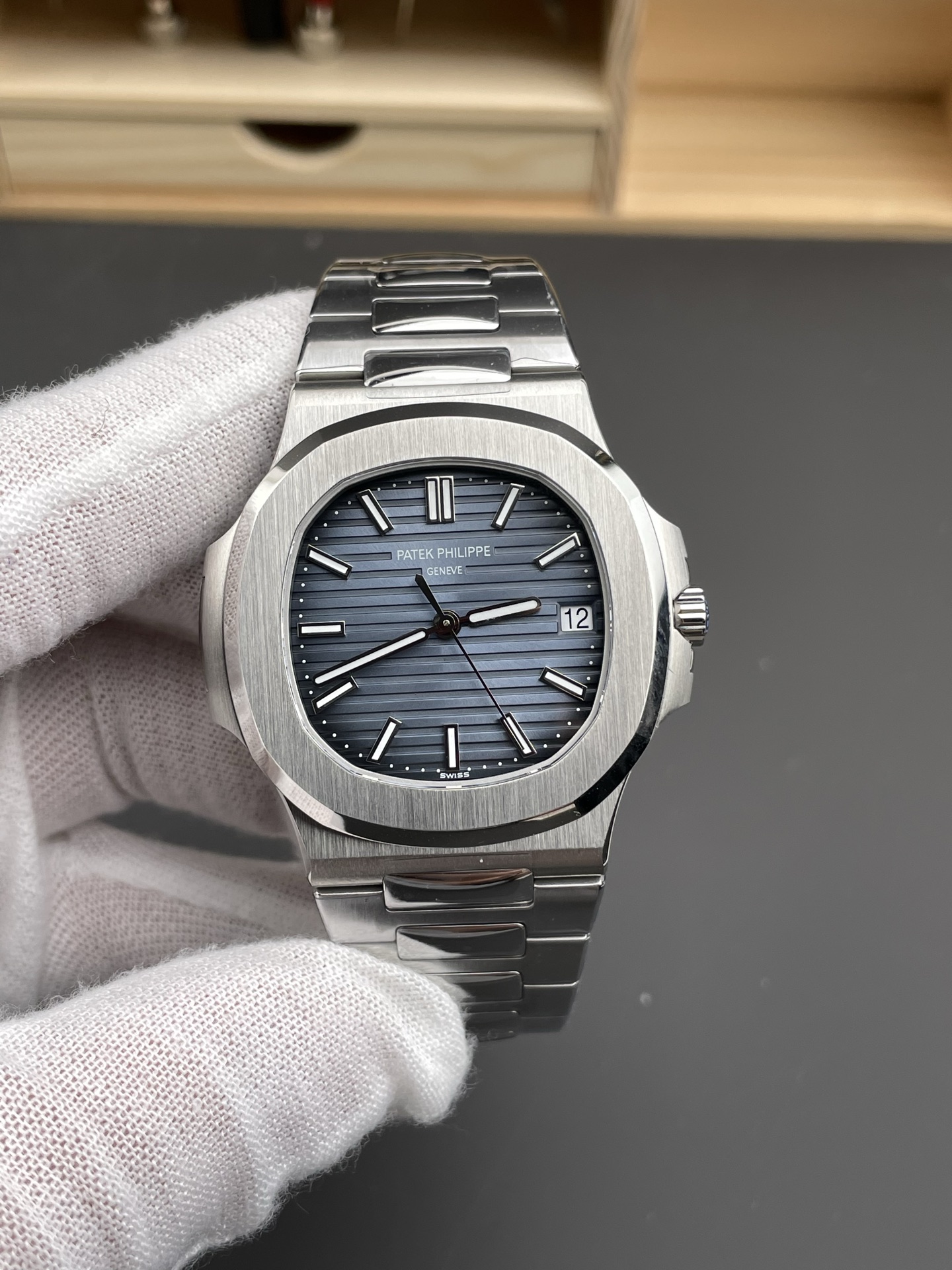 This is the one. The 5711/1A-010 — time-and-date Nautilus, blue dial, integrated steel bracelet. No chronograph, no moonphase, nothing extra. Patek Philippe produced the -010 from 2010 to January 2021, running caliber 324 SC before switching to the 26-330 SC with stop-seconds. The suffix means blue dial on steel bracelet. This replica Patek Philippe Nautilus 5711 is 904L steel: case, bezel, bracelet, clasp.40 mm, blue embossed dial, 904L steel. The 5711/1A-010 is the reference that turned the Nautilus from a collector’s piece into a cultural object — and then Patek discontinued it.