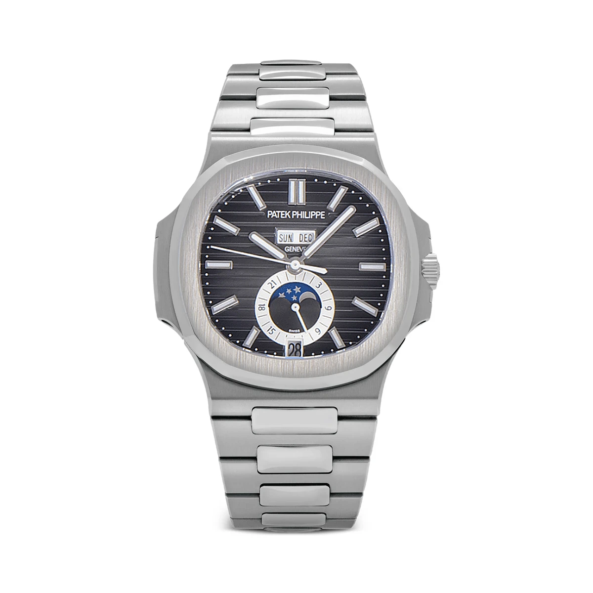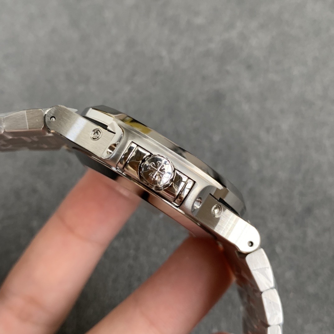 40.5 mm diameter, 11.3 mm thick. The annual-calendar module adds roughly 3 mm over the time-only 5711. Steel octagonal bezel with alternating satin and polished bevels. Push-in crown. Sapphire caseback, AR-coated both sides.