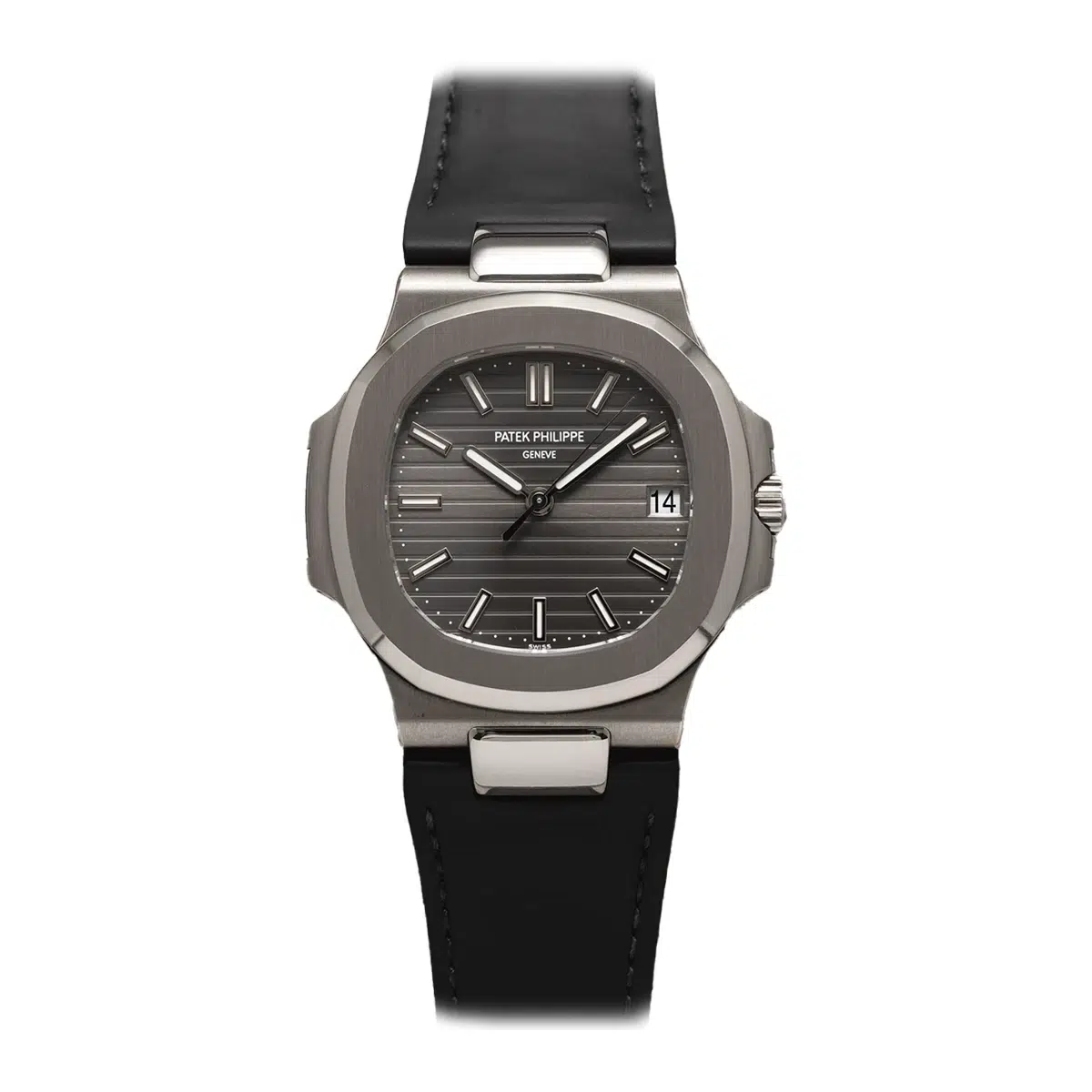 White-gold Nautilus 5711G originals on leather command premiums well above retail. This replica Nautilus 5711 reproduces the grey-dial white-gold leather variant. Full