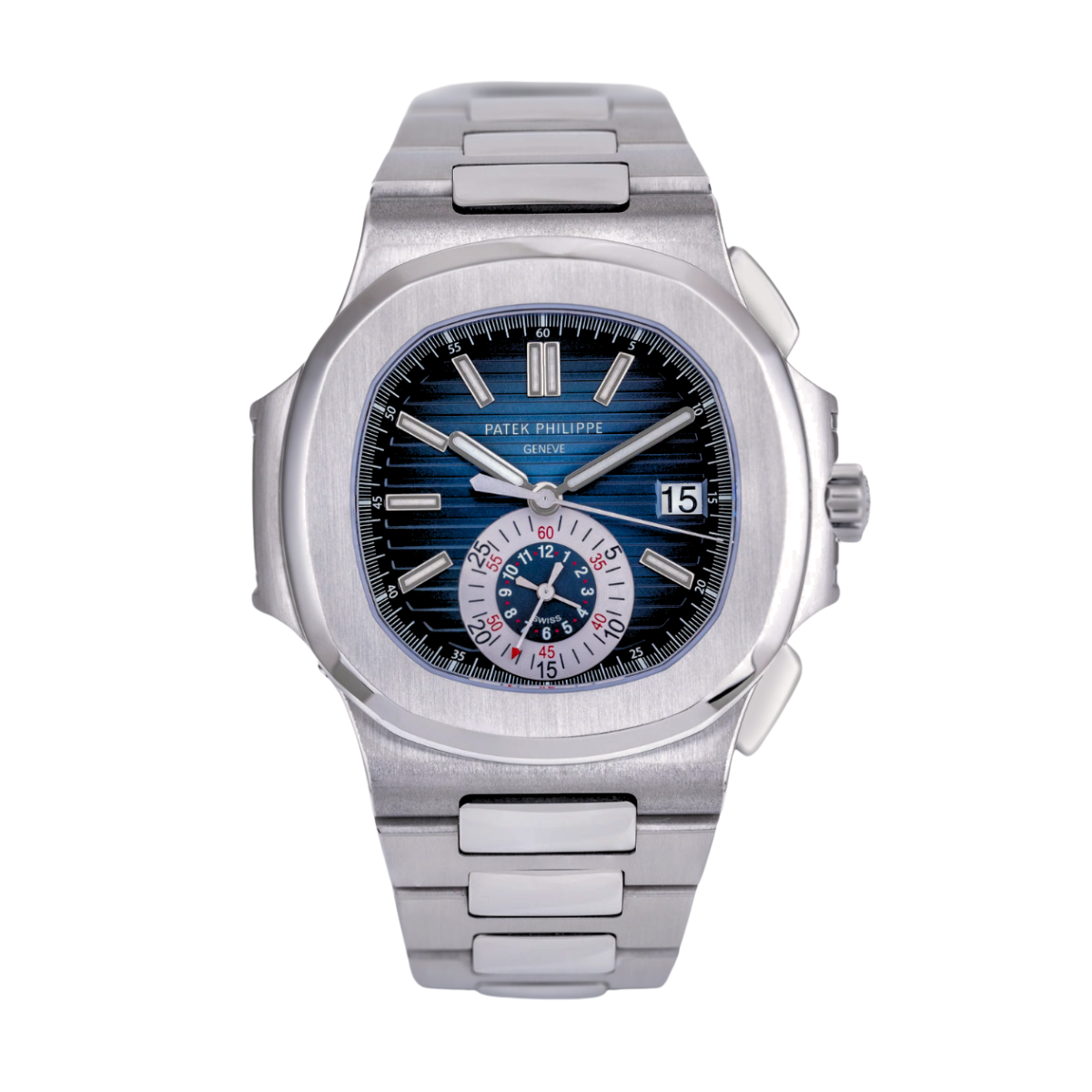 The 5980/1A-015 is the silver-dial version of Patek’s steel flyback chronograph Nautilus. Same column-wheel caliber CH 28-520 C FUS, same two subdials, same integrated bracelet — but the -015 silver dial shifts the visual register from the sporty blue or black variants toward something more neutral. This replica Patek Philippe Nautilus 5980 is built in 904L steel: case, bezel, bracelet, deployment clasp.