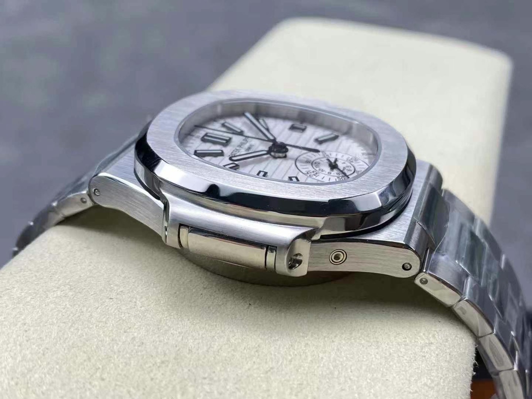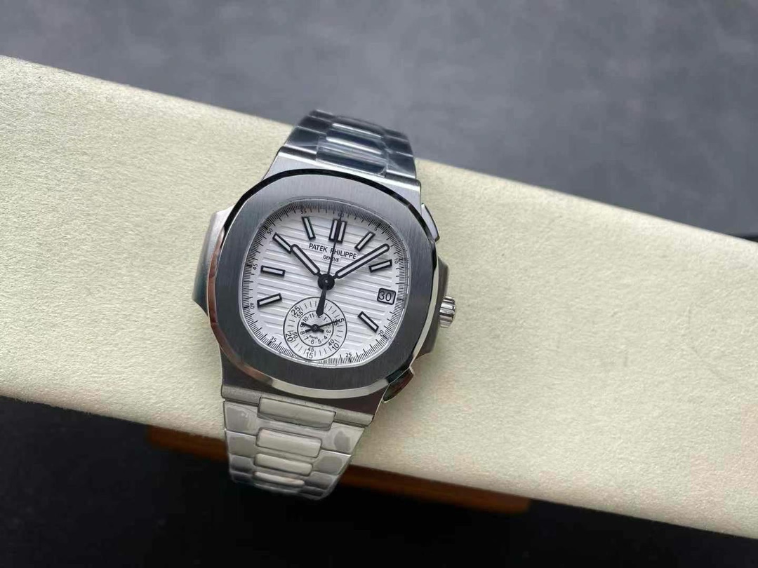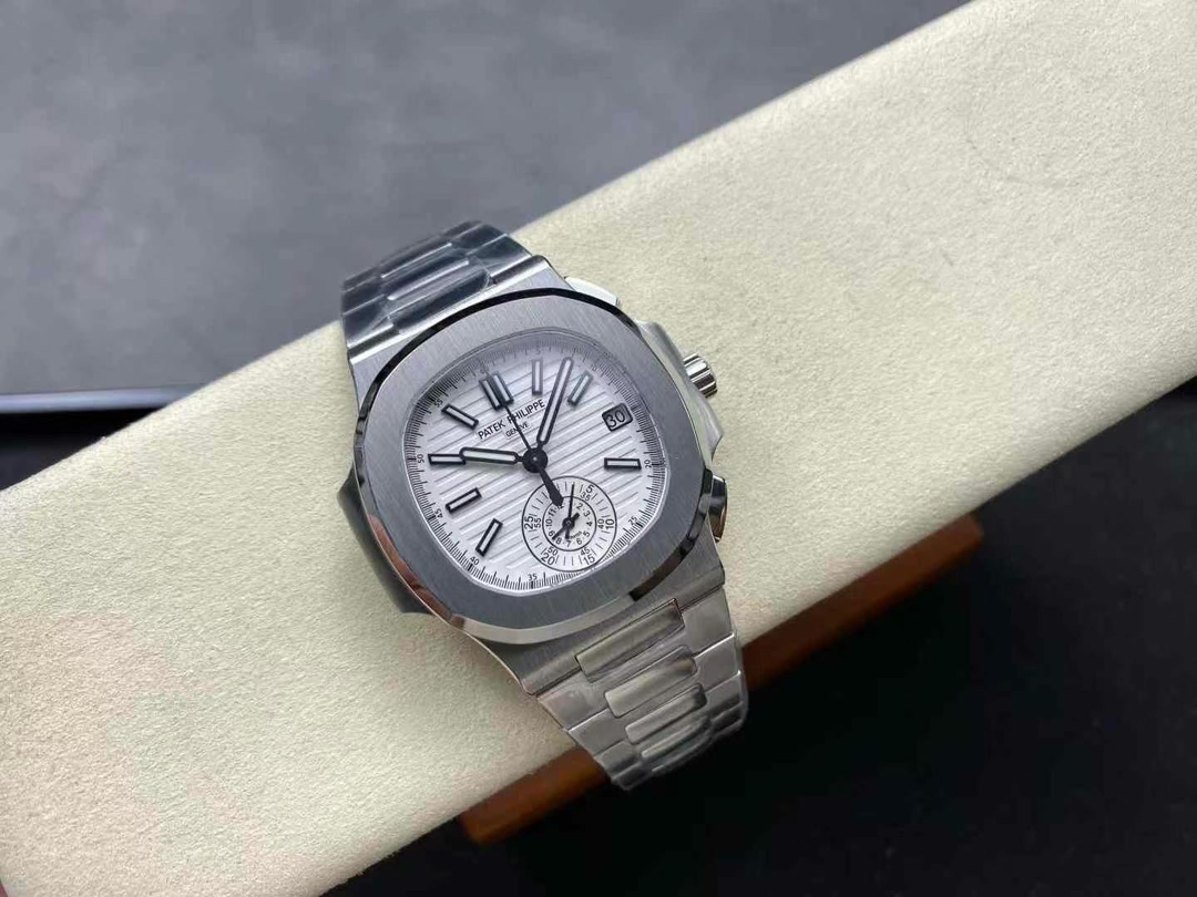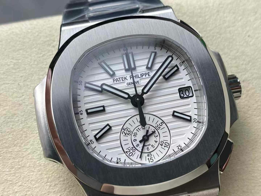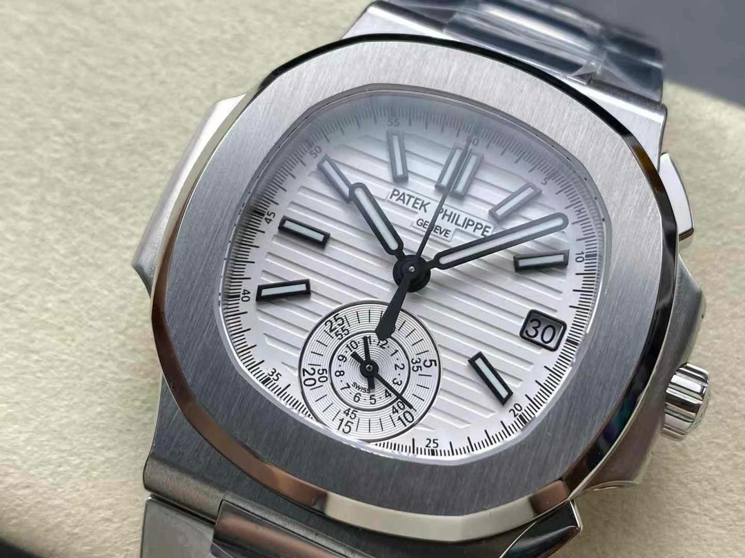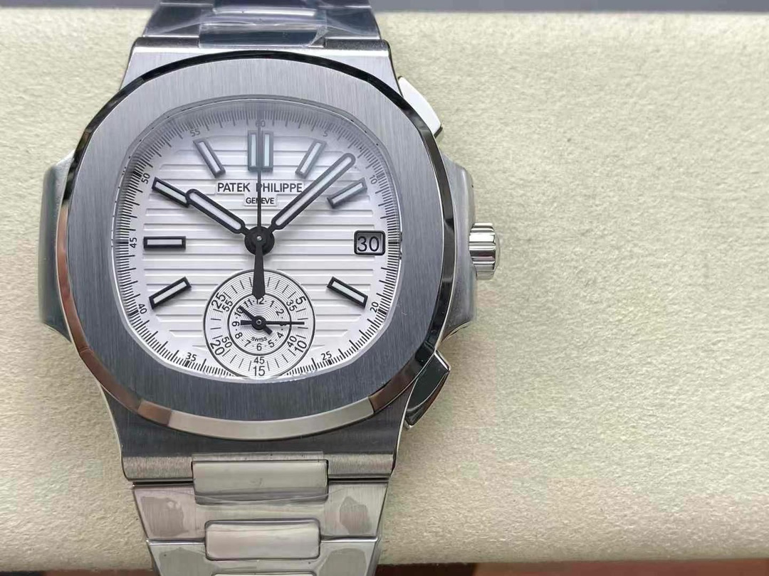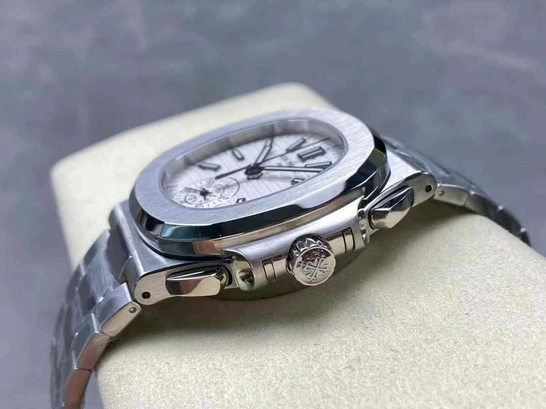 The 5980/1A is the only Nautilus reference fitted with a flyback chronograph. Patek Philippe produced it from 2006 to 2019 on caliber CH 28-520 C FUS — column-wheel mechanism, two subdials, date integrated into the upper counter. The -019 suffix marks the white-dial variant on an integrated steel bracelet. This replica Patek Philippe Nautilus 5980 is built in 904L steel: case, bezel, bracelet, deployment clasp.