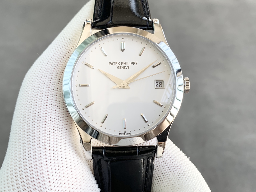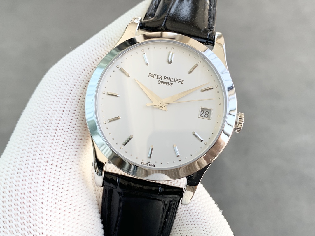 The Calatrava launched Patek Philippe’s identity in 1932 — Reference 96 established what a dress watch should be. Round case, clean dial, leather strap. This 38 mm variant follows that original blueprint at its most minimal: two hands, applied markers, and a white face without date window or subdials. This replica Patek Philippe Calatrava is built in 904L steel: case, bezel, caseback.