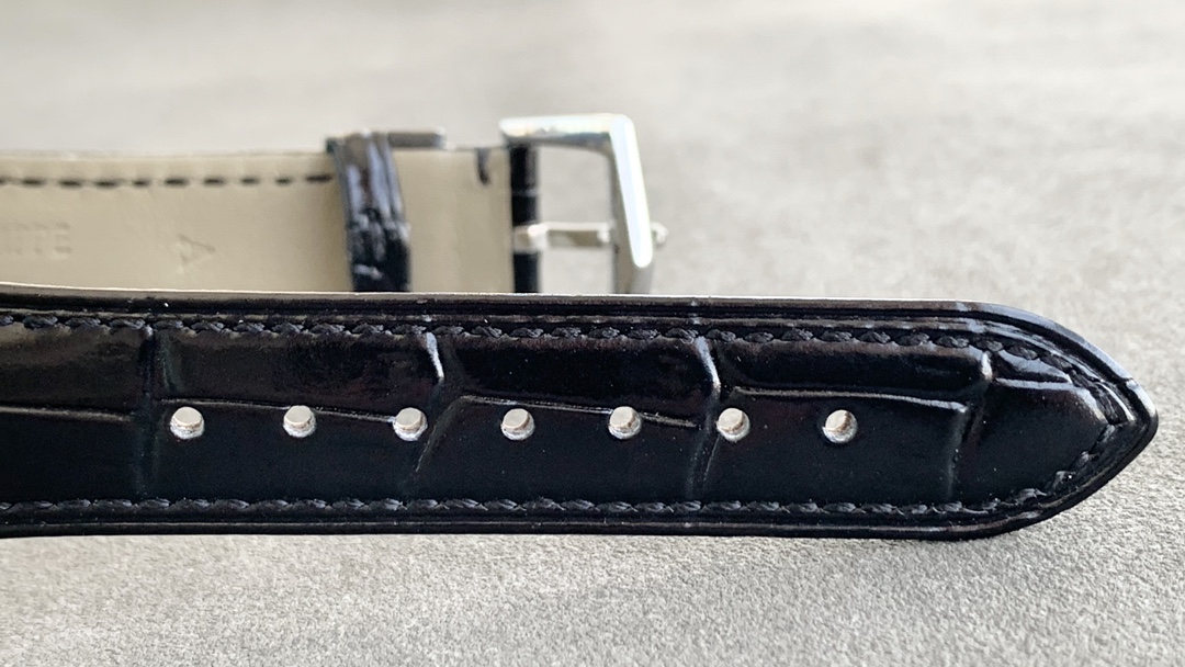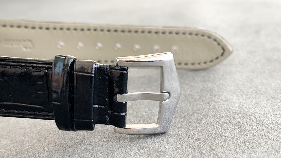 Black alligator-pattern leather with hand-stitched edges, secured by a polished tang buckle. Total weight stays under 65 grams on wrist — roughly half what a steel-bracelet
