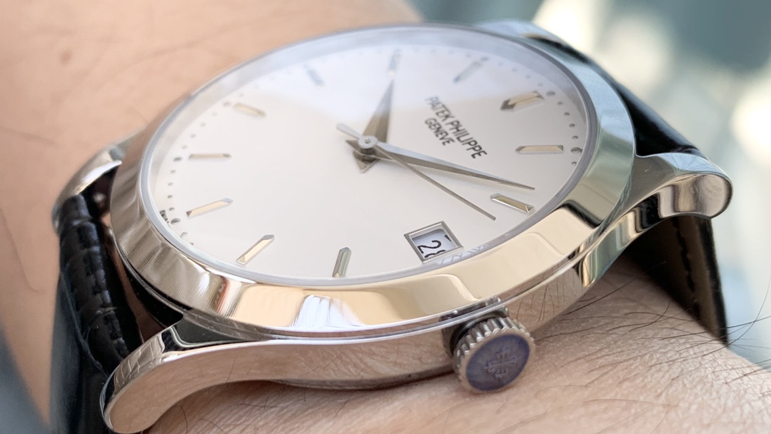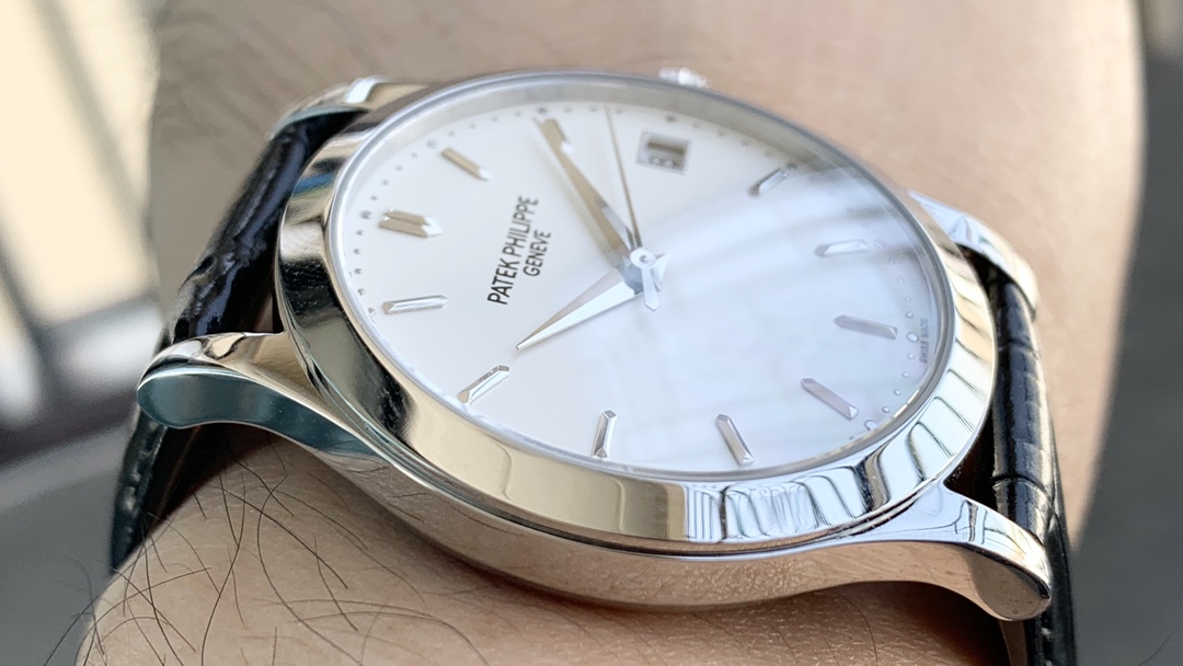 38 mm case, white baton dial, and a profile thin enough to slide under any cuff — a time-only steel Calatrava built around negative space.