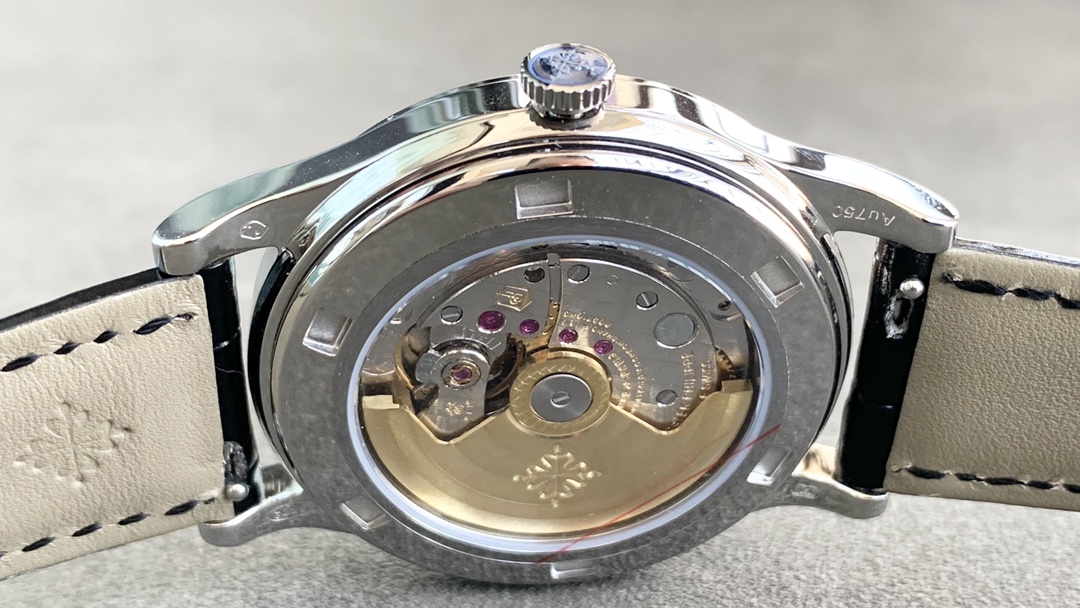 38 mm diameter. Polished round bezel flows into slim lugs — no crown guards, no angular bevels, just a continuous curve from twelve to six. Push-in crown at three with the Calatrava cross emblem. Sapphire crystal front, solid caseback. 904L steel carries higher chromium content than 316L, holds its polish longer, handles daily contact with desk edges and shirt cuffs.