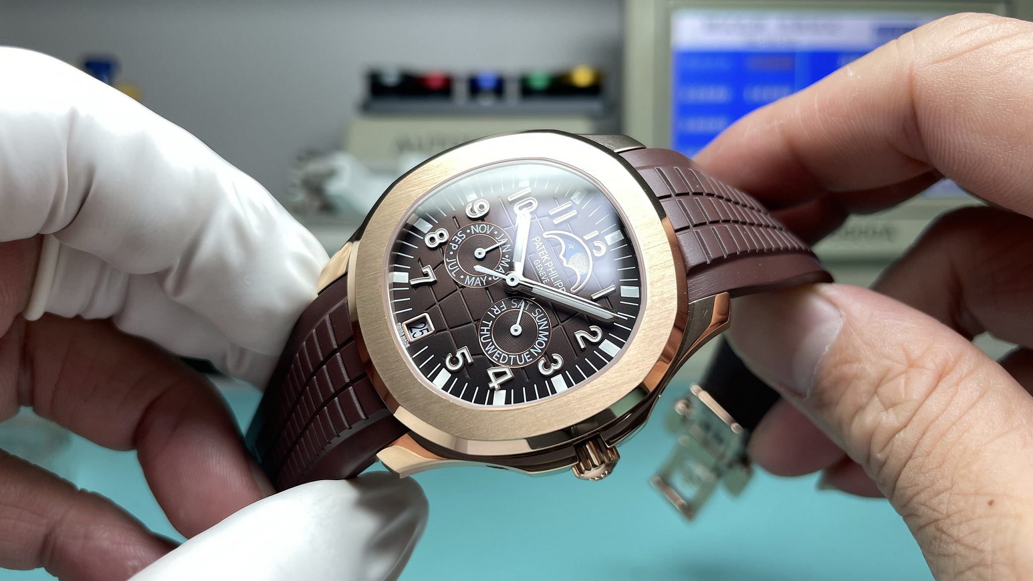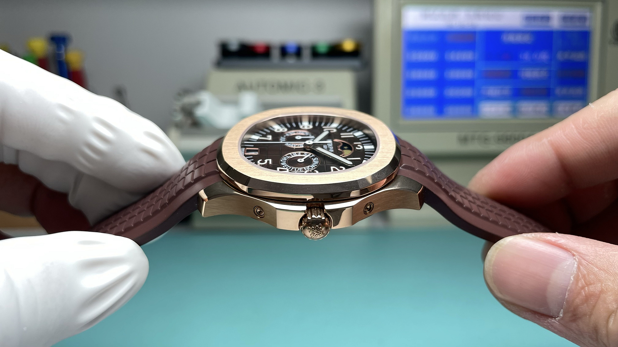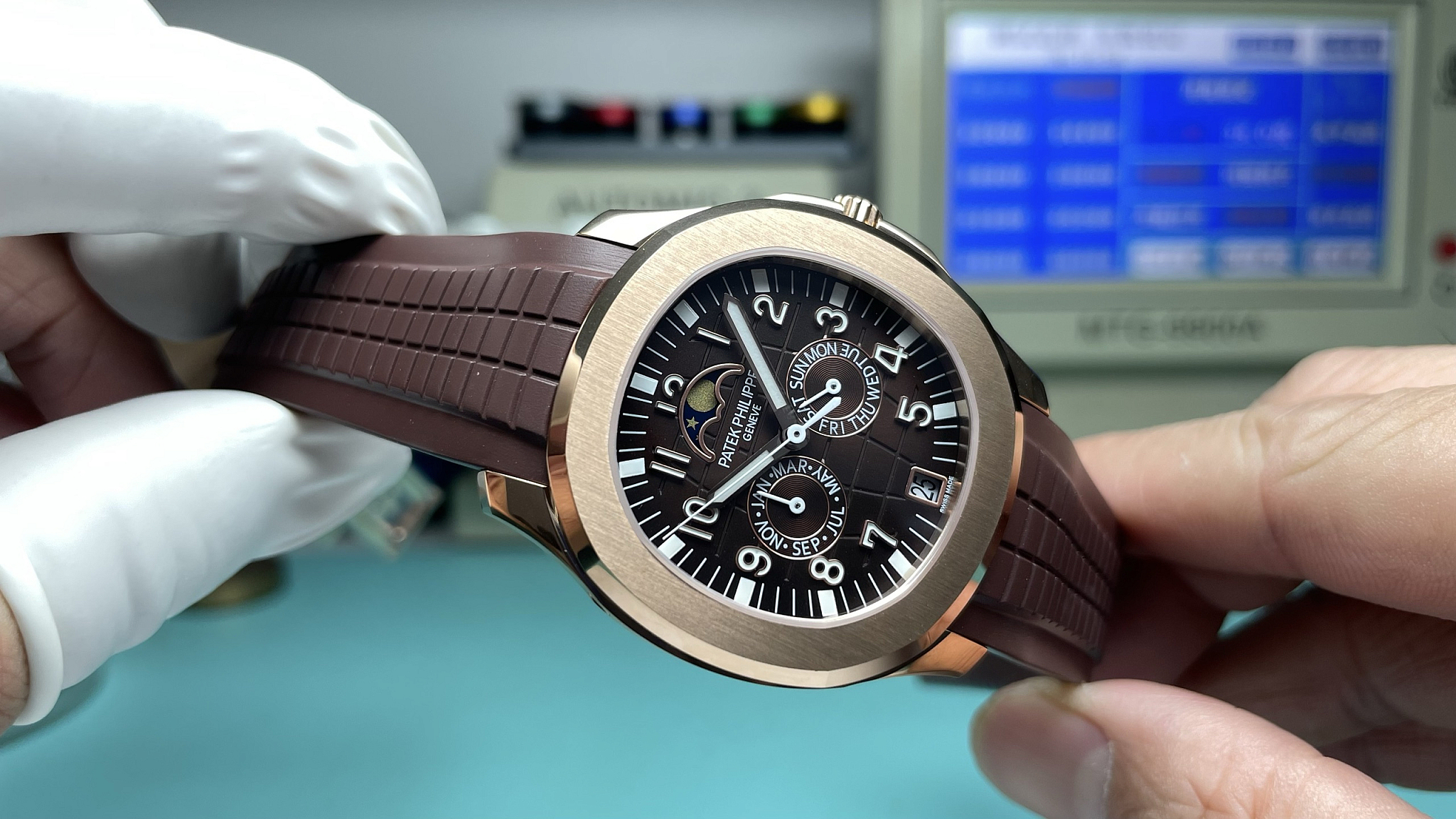 The 5261R-001 Luce Annual Calendar with brown dial on rose gold. The brown-and-rose-gold combination follows the same tonal logic Patek established on the men’s 5167R: warm case metal paired with a brown embossed dial that absorbs rather than contrasts the surrounding colour. Annual Calendar displays day, date, and month in three apertures, moon phase at 6, correcting automatically for 30/31-day months. Forty-six diamonds on the bezel. This replica Patek Philippe Aquanaut Luce Annual Calendar is built in rose gold: case, diamond bezel, crown, clasp.