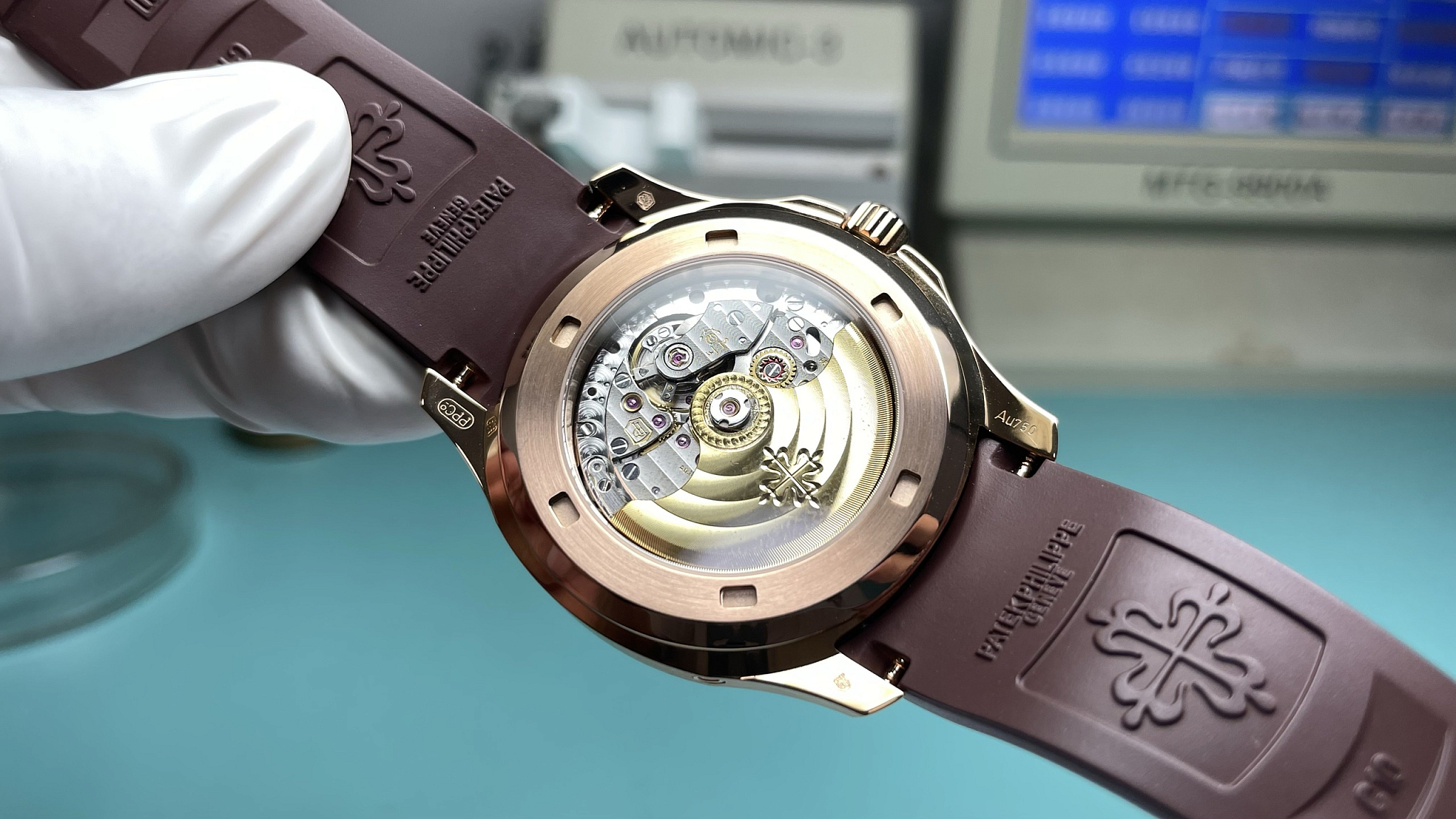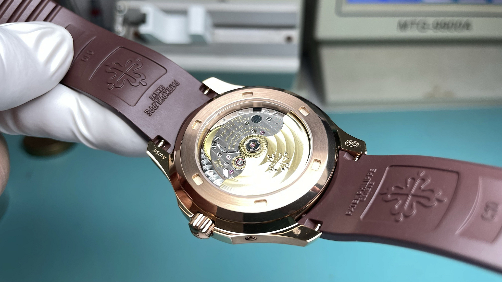 Caliber 324 S QA LU 24H, automatic, 28,800 vph. 40+ hour power reserve. Annual Calendar with moon phase. Through the caseback: Côtes de Genève, perlage, rose-gold-tone rotor. SuperClone tier: ±8 sec/day. Full specs on our
