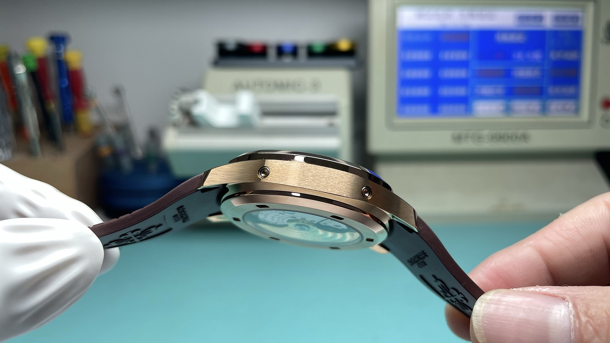 39.9 mm diameter, 10.2 mm thick. Rose-gold-tone rounded octagonal bezel set with forty-six brilliant-cut CZ diamonds. Satin flanks, polished crown. Sapphire caseback, AR-coated.