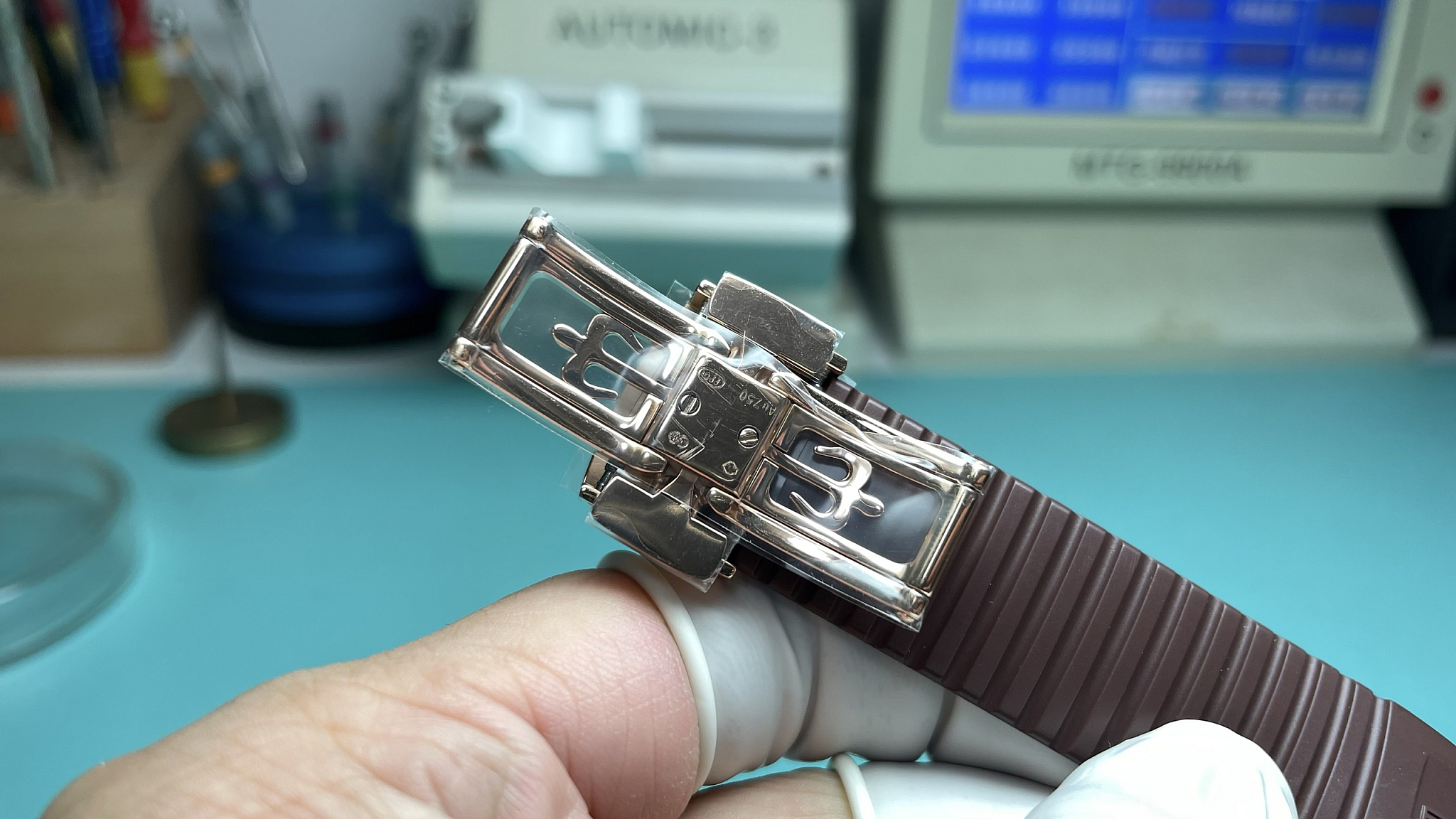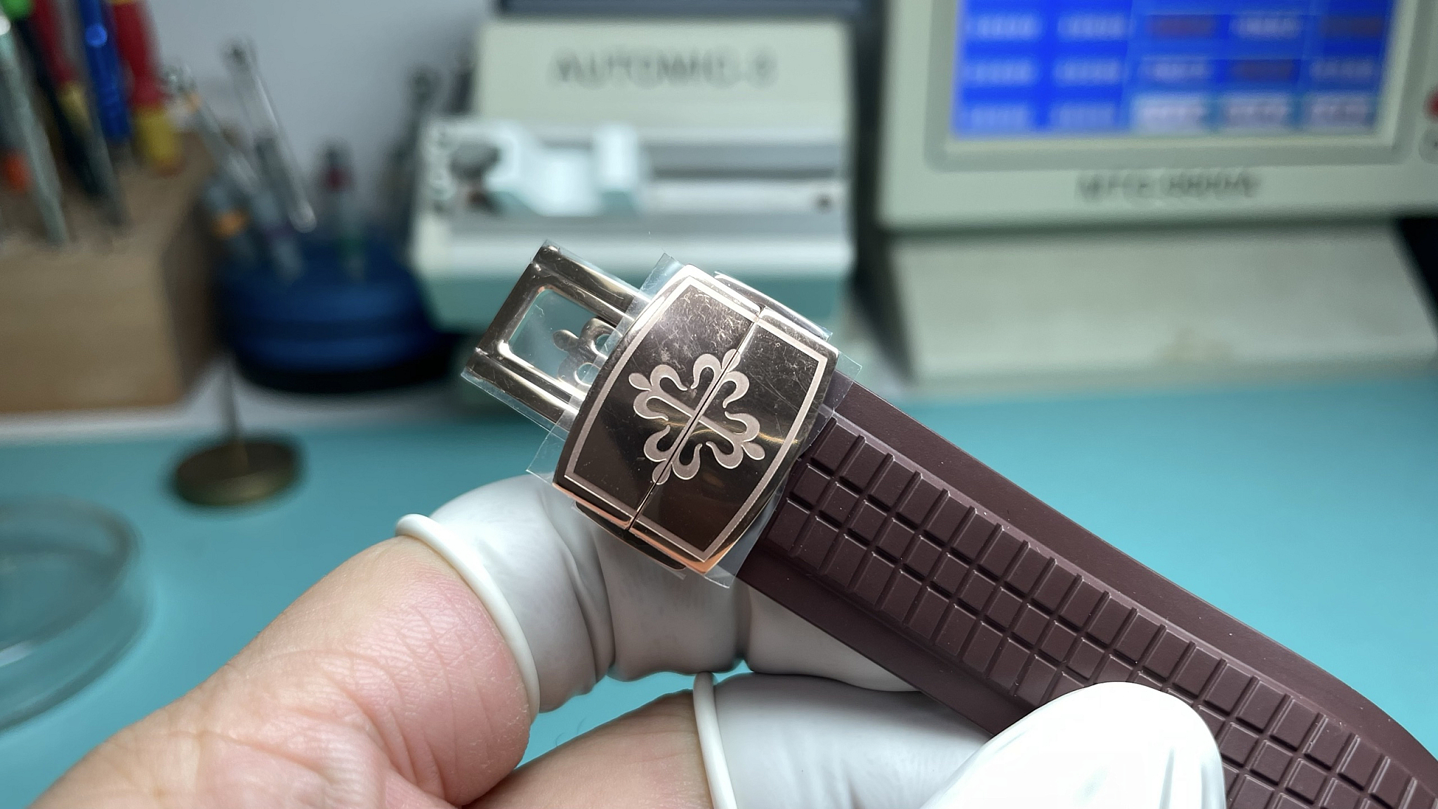 Brown composite strap with rose-gold-tone deployment clasp. Chequerboard-molded surface. The strap continues the tonal match from case through dial to wrist. The