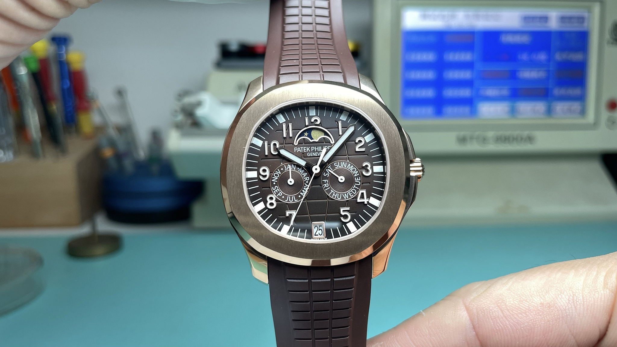 Brown embossed dial with chequerboard pattern. Chocolate base that warms toward caramel under direct light. Three calendar apertures: day at 10, date at 12, month at 2. Moon phase at 6. Applied rose-gold-tone luminous Arabic numerals. The brown dial makes the rose-gold markers and hands disappear slightly into the warm field — a deliberate low-contrast design that reads as one warm mass rather than individual elements competing for attention.