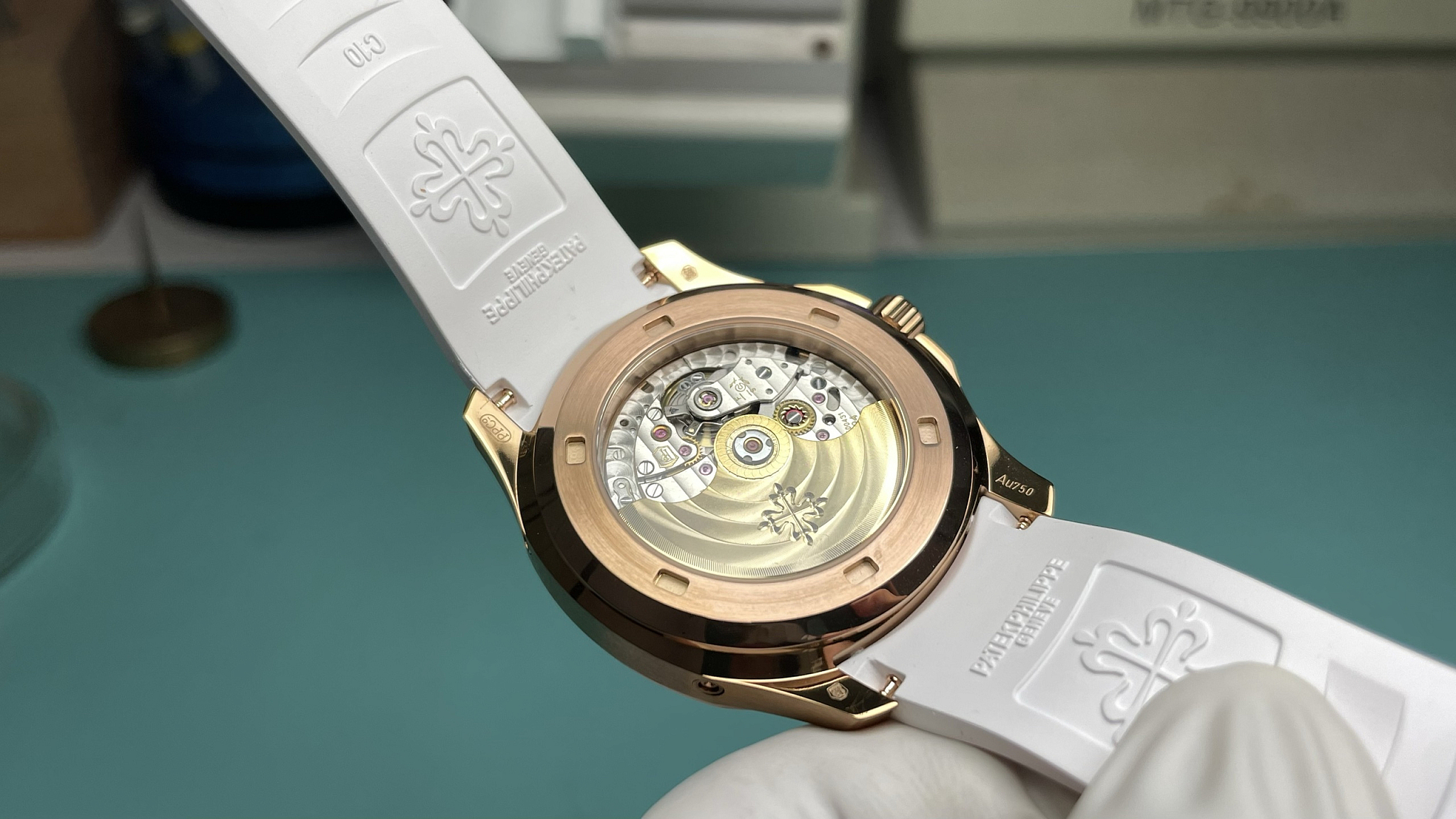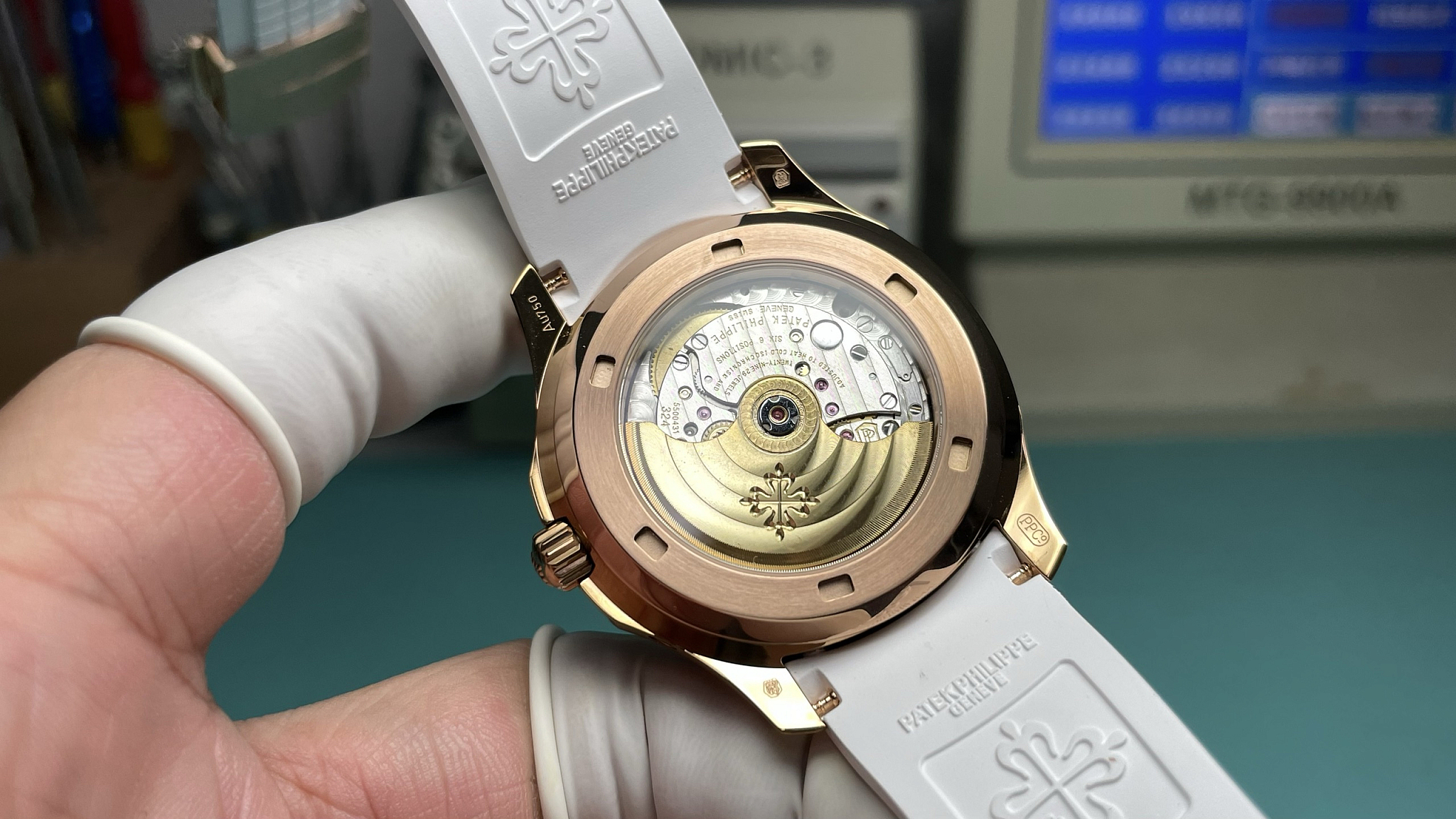 Caliber 324 S QA LU 24H, automatic, 28,800 vph. 40+ hour power reserve. Annual Calendar: day, date, month, moon phase. Manual correction required only on March 1st. Through the caseback: Côtes de Genève, perlage, rose-gold-tone rotor. SuperClone tier: ±8 sec/day. Full specs on our