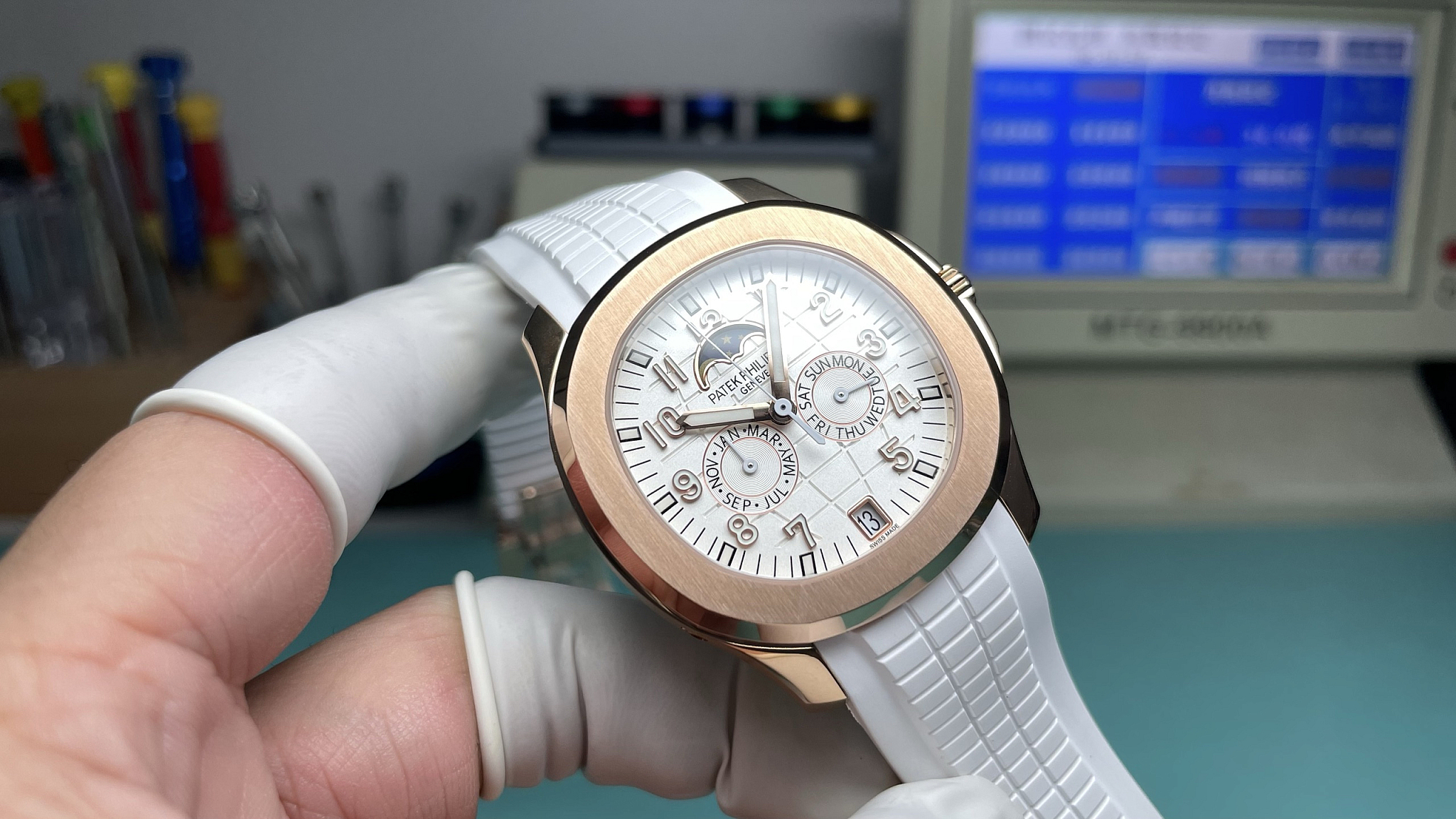 White embossed dial with chequerboard pattern. Three calendar apertures: day at 10, date at 12, month at 2. Moon phase at 6. Applied rose-gold-tone luminous Arabic numerals. The white background makes the aperture text, moon phase disc, and hand positions sharper than on the