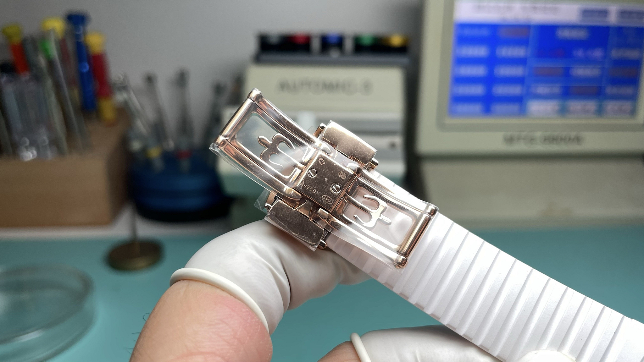 White composite strap with rose-gold-tone deployment clasp. Chequerboard-molded surface. The bright strap extends the dial’s luminous quality to the wrist. The