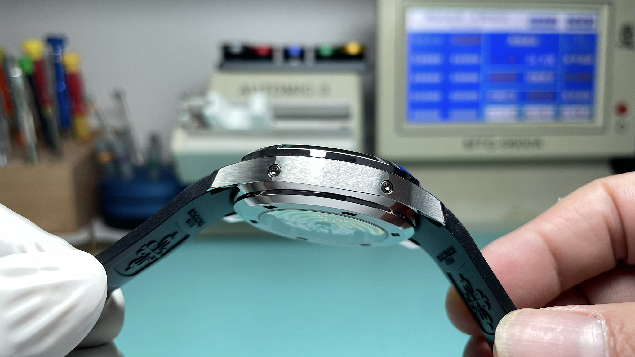 39.9 mm diameter, 10.2 mm thick. White-gold-tone rounded octagonal bezel set with forty-six brilliant-cut CZ diamonds. Satin flanks, polished crown. Sapphire caseback, AR-coated.