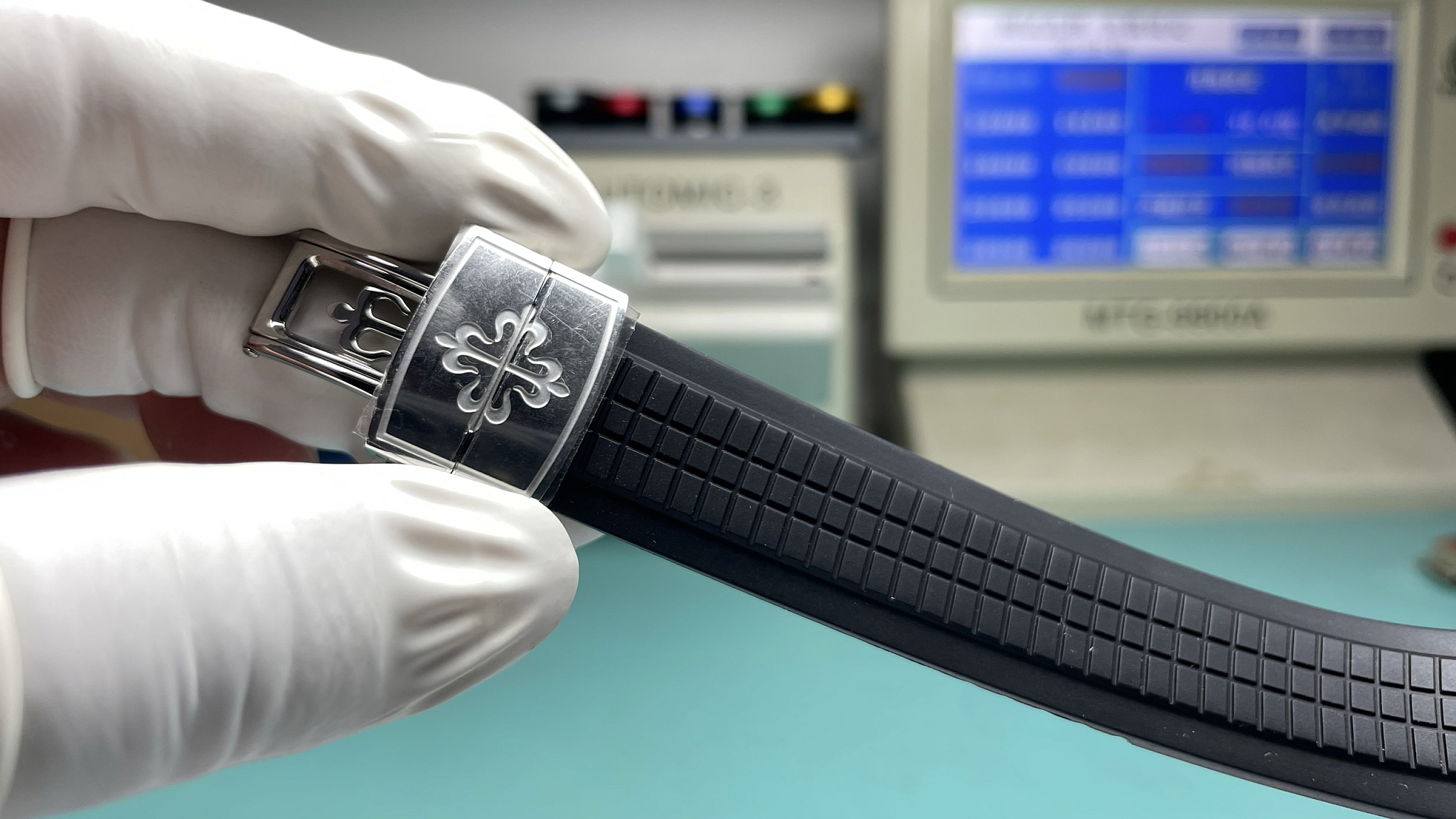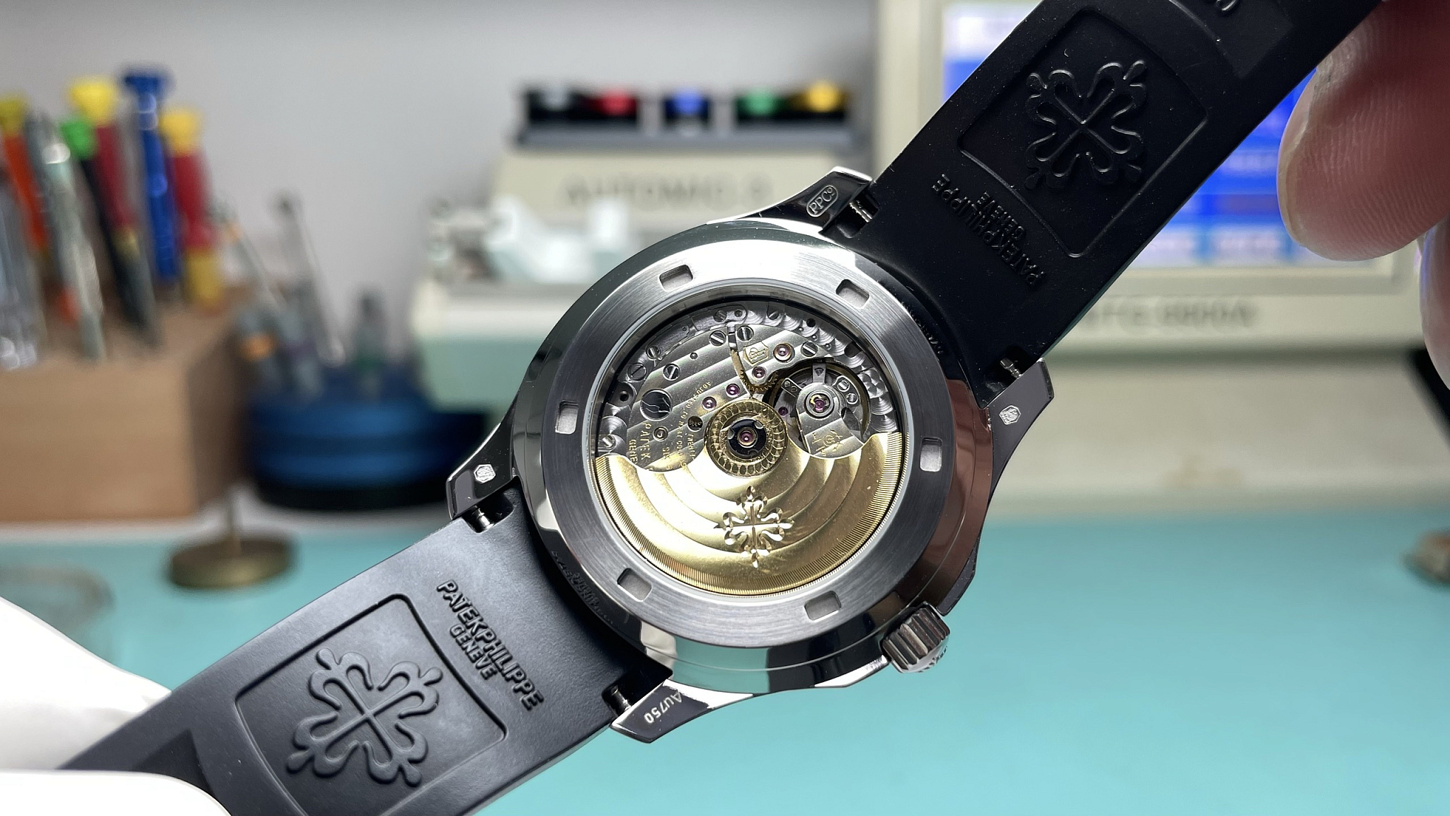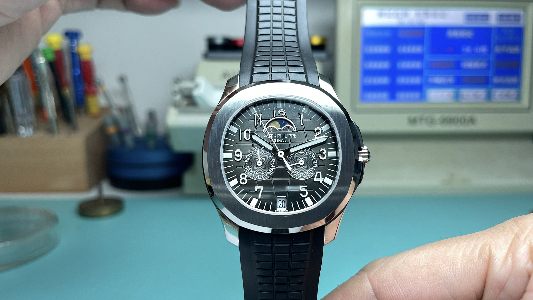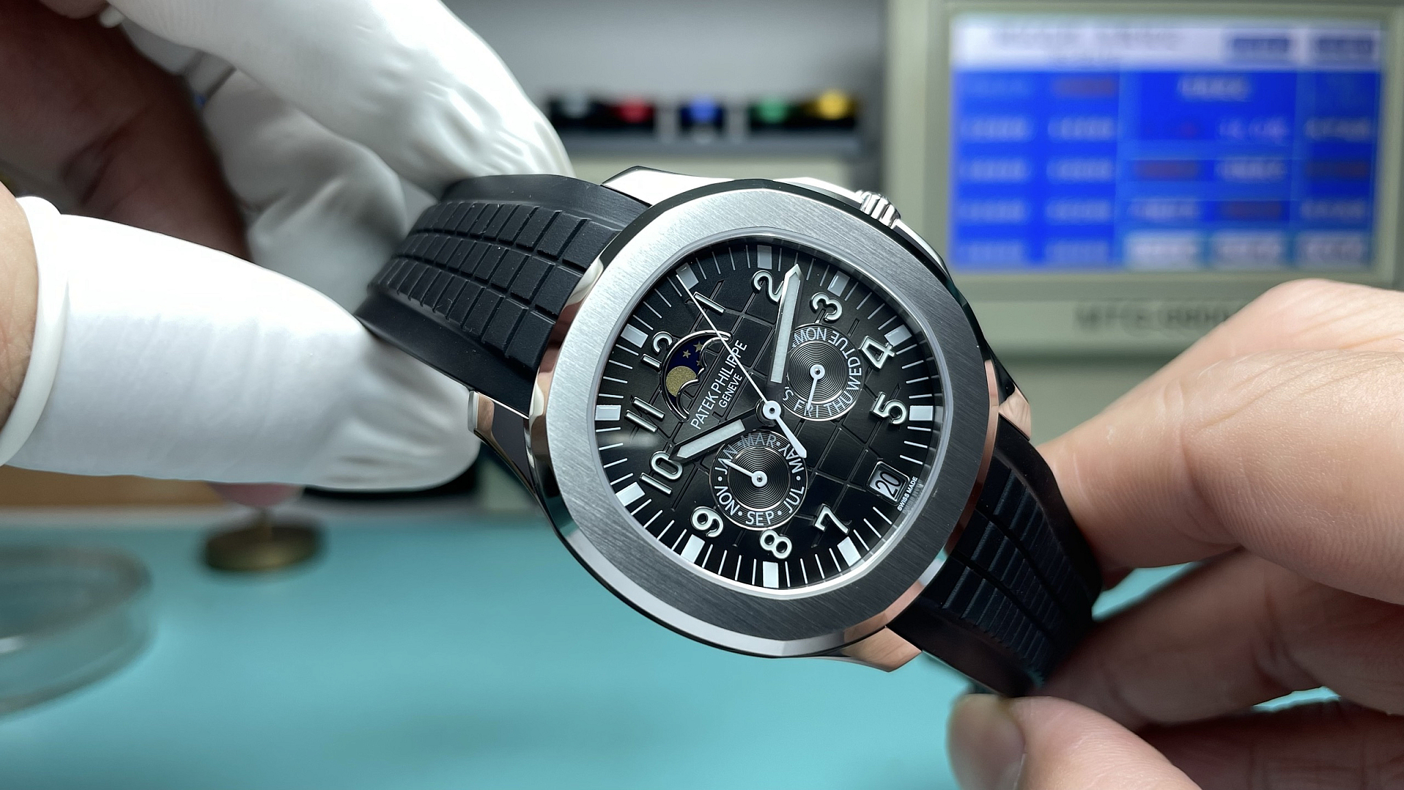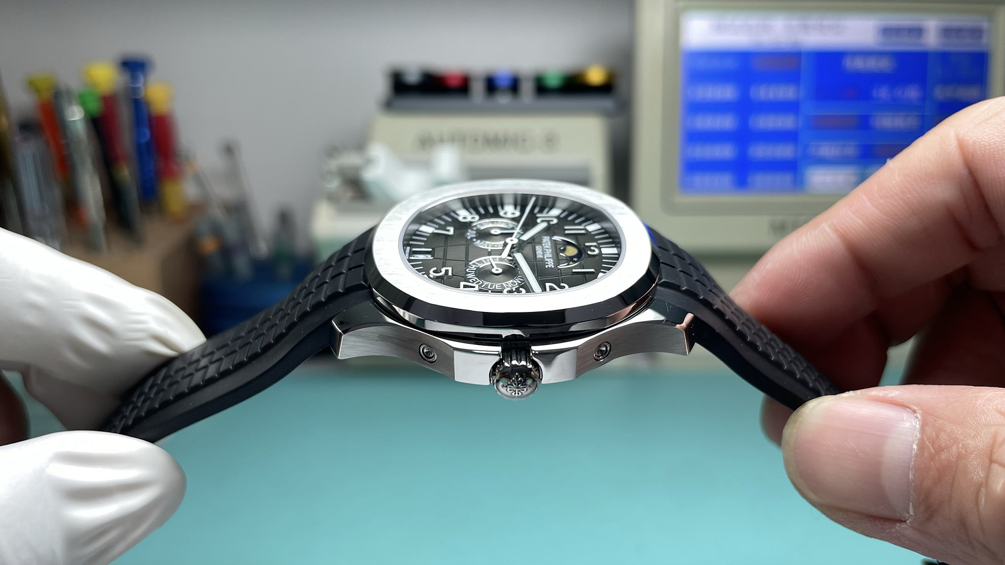 5261R rose-gold variant runs bright and open; this black-dial white-gold version runs dark and formal. The