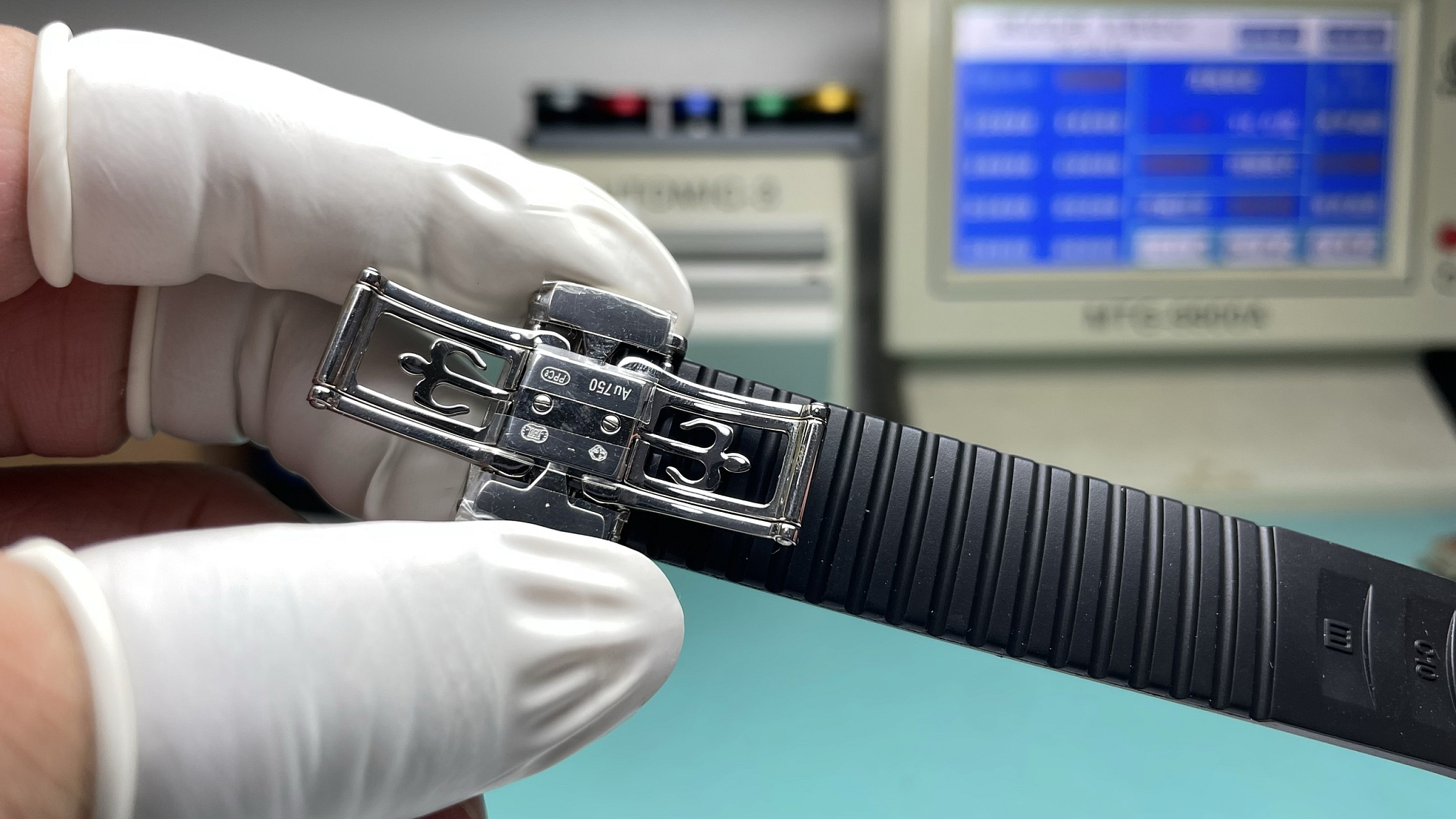 Black composite strap with white-gold-tone deployment clasp. Chequerboard-molded surface. The all-dark strap and dial against the bright diamond bezel creates a tuxedo-like contrast. The white-dial