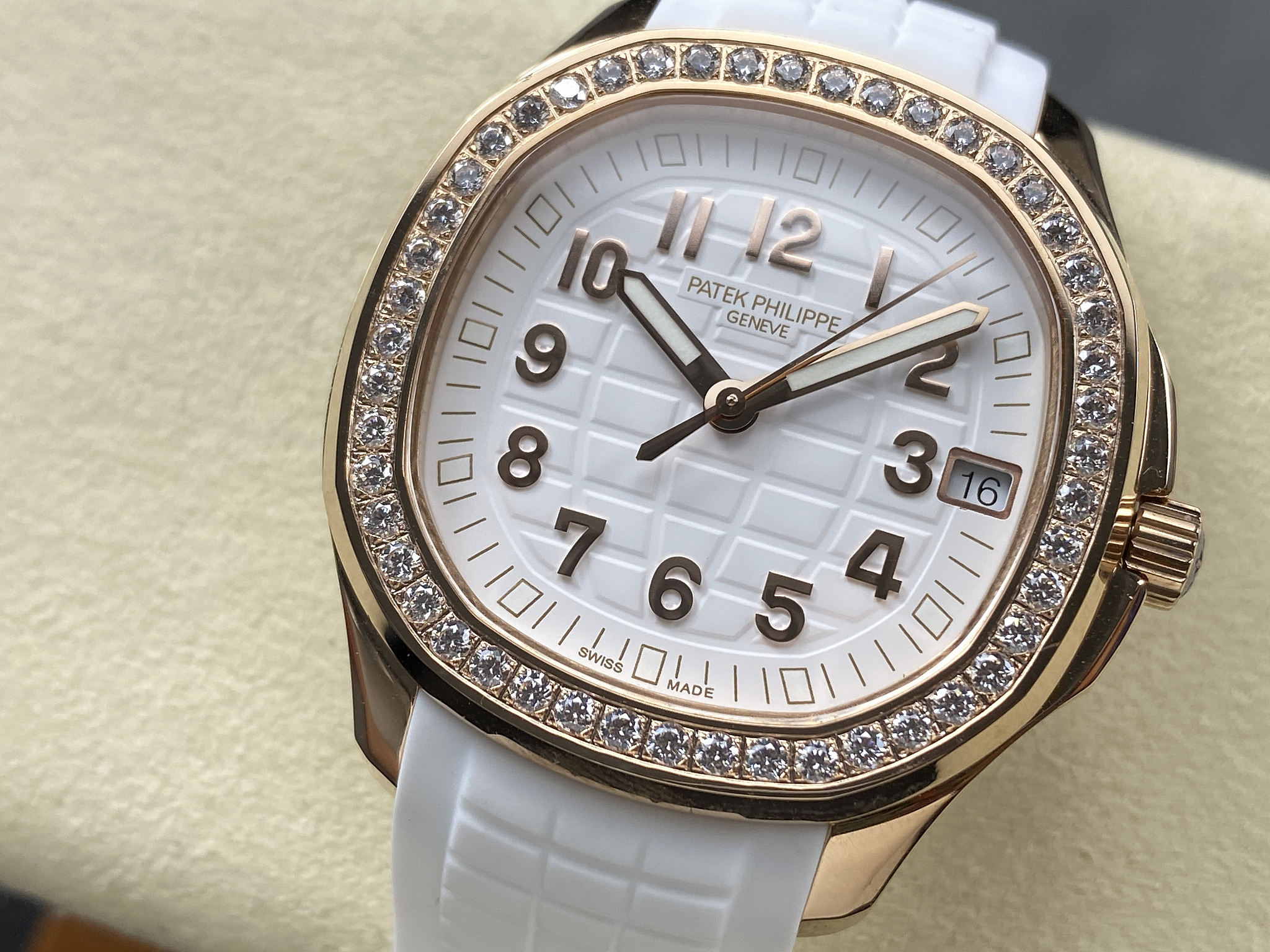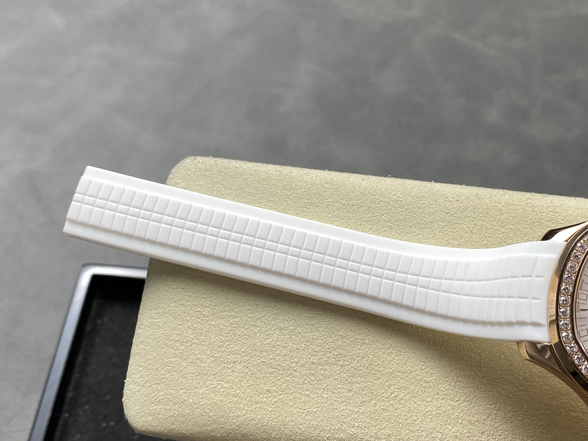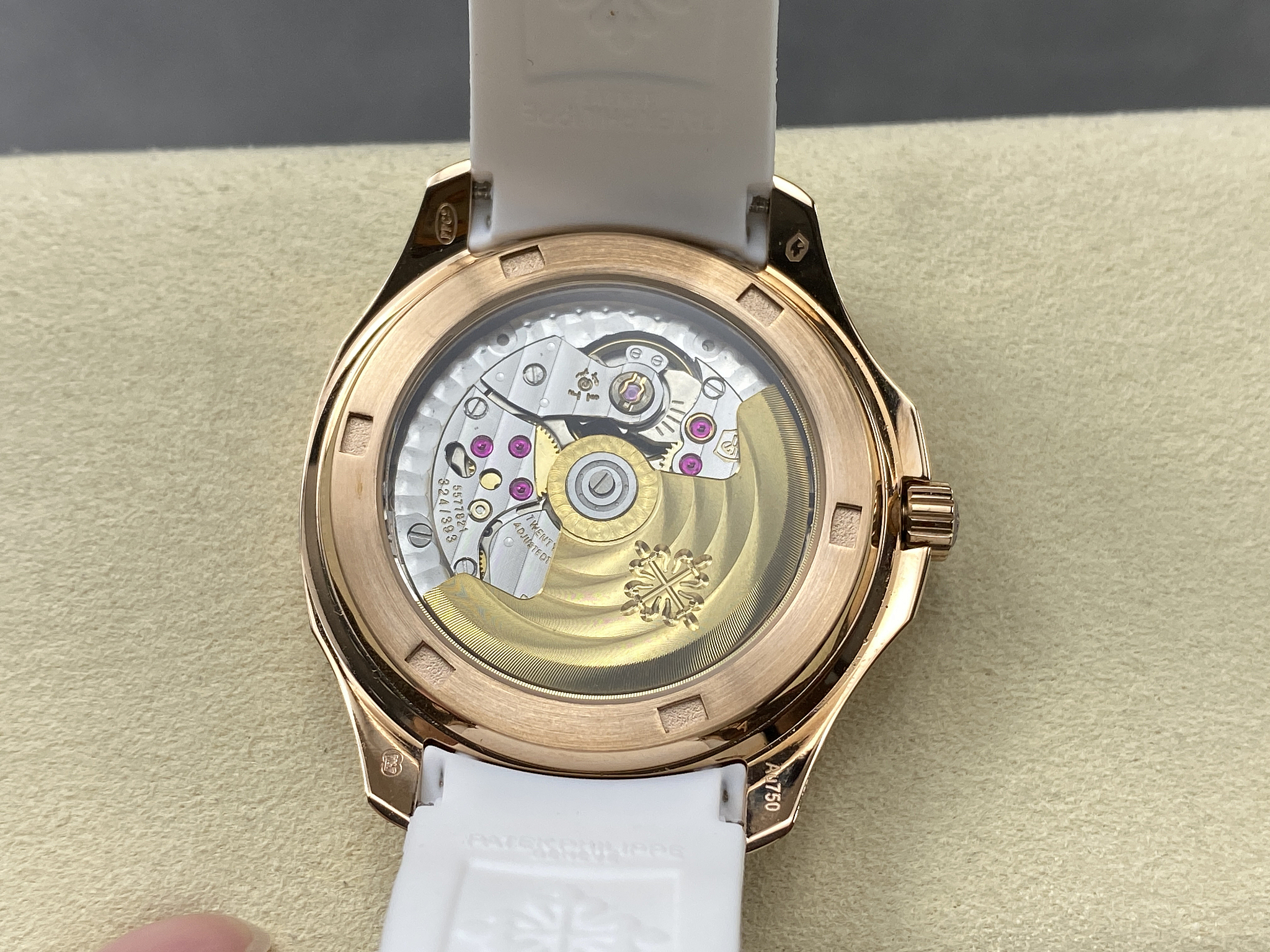 Rose-gold 5268R Luce originals with white dial trade above $55K. This replica delivers the same 38.8 mm diamond-set Aquanaut in rose gold with white chequerboard dial. Full