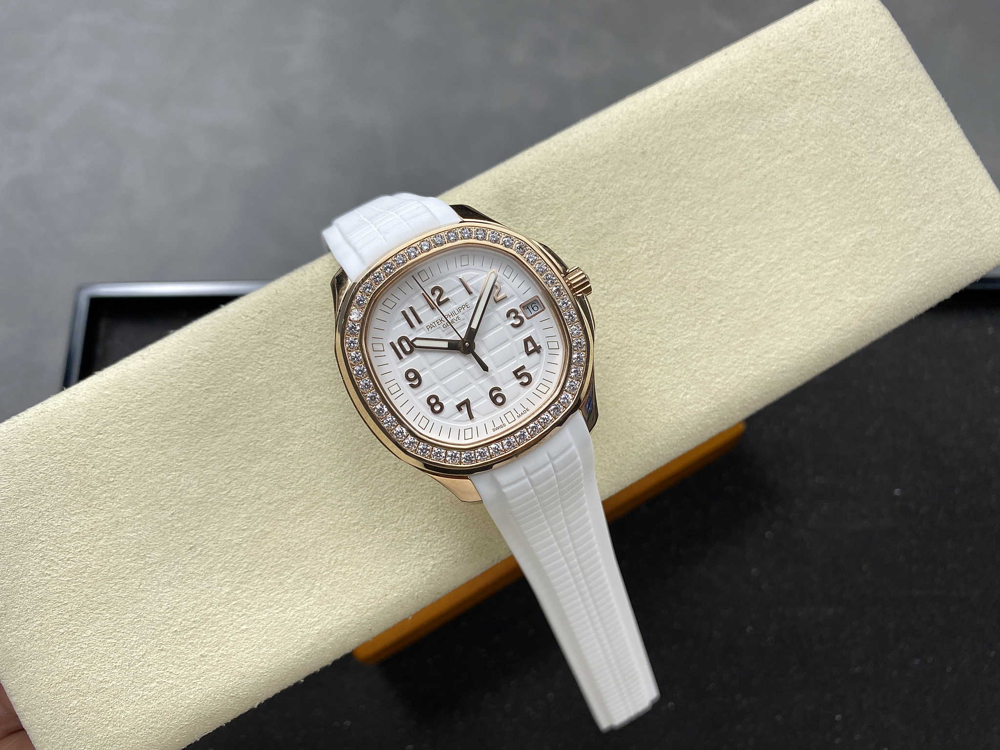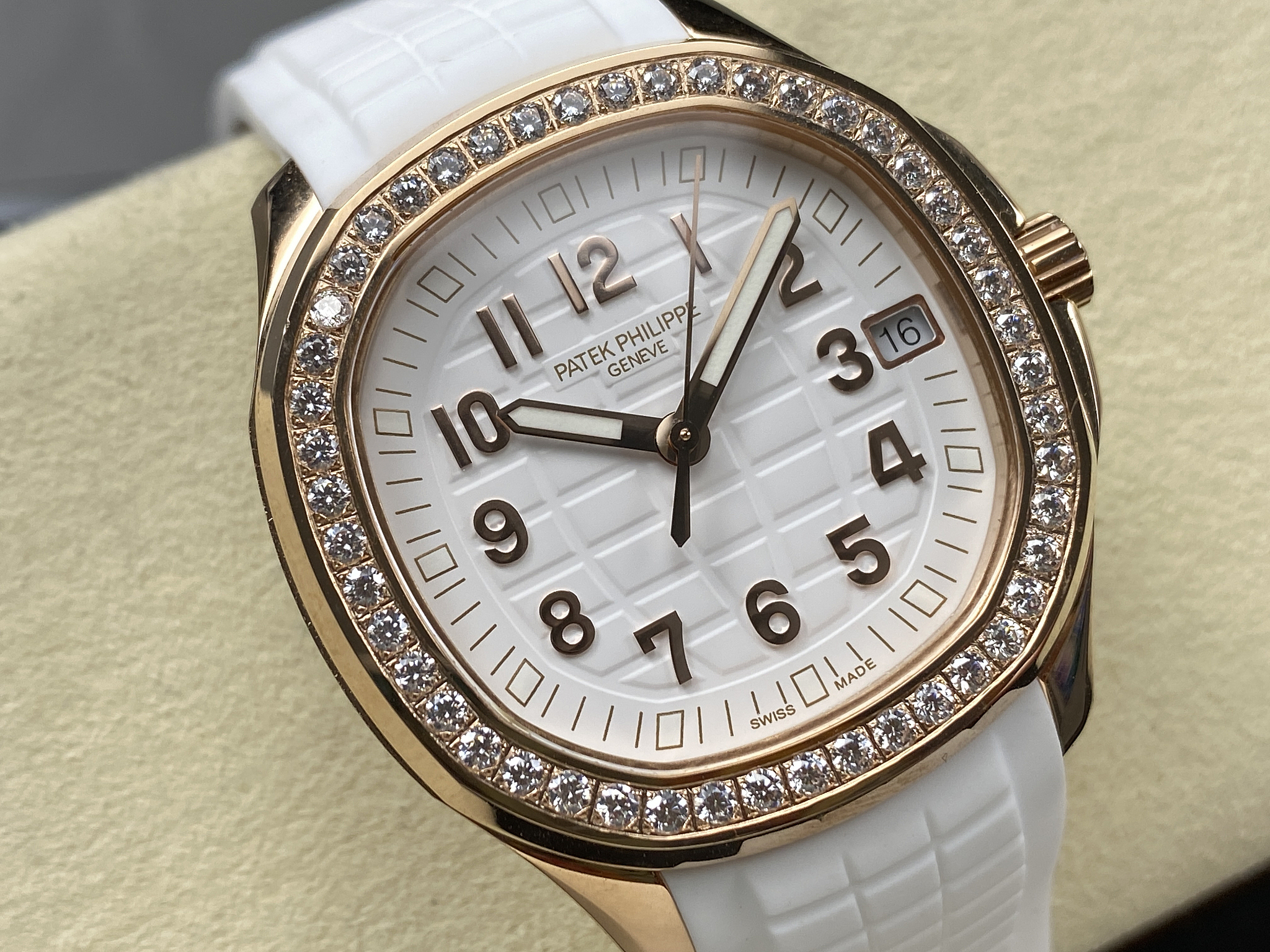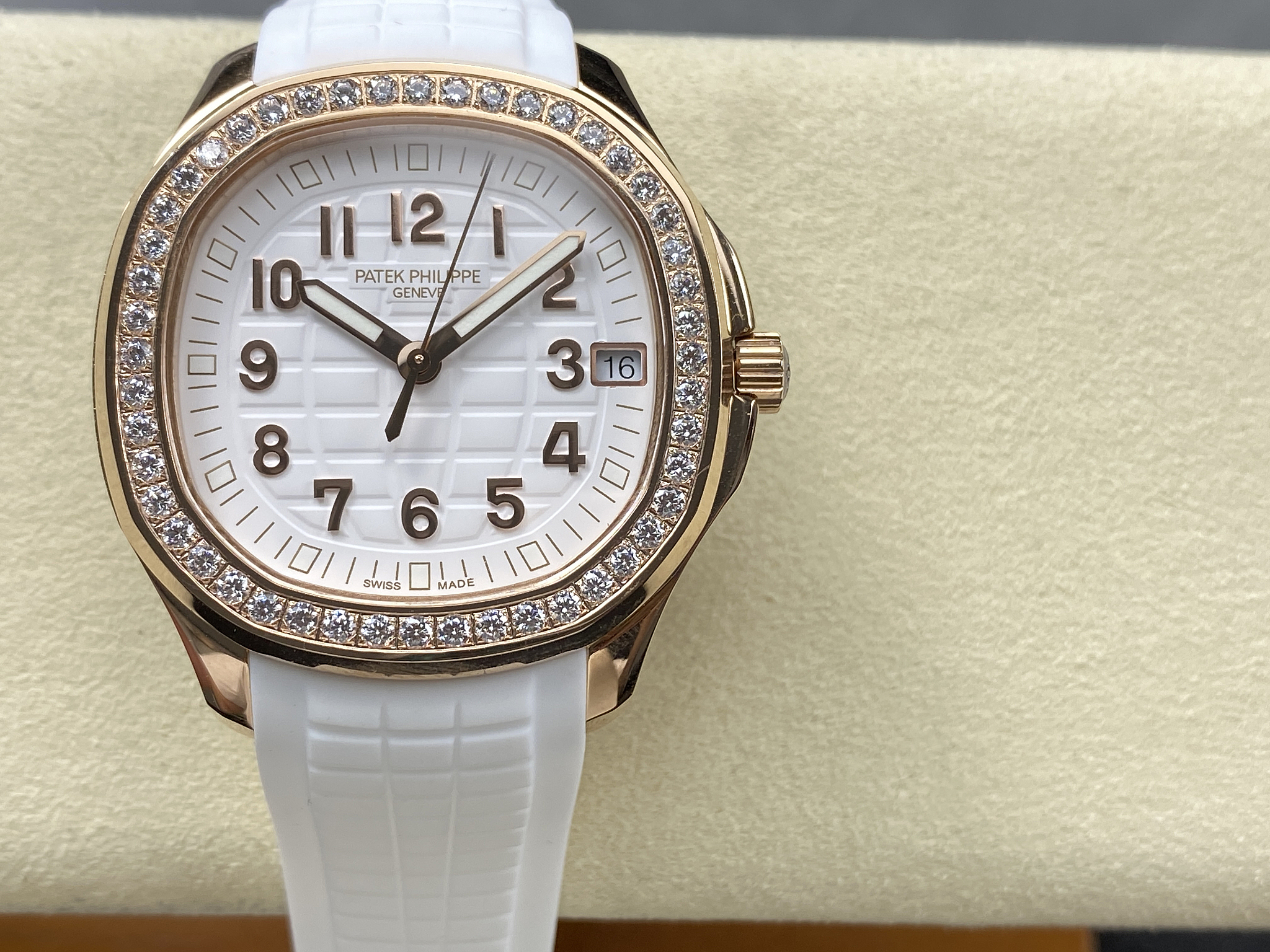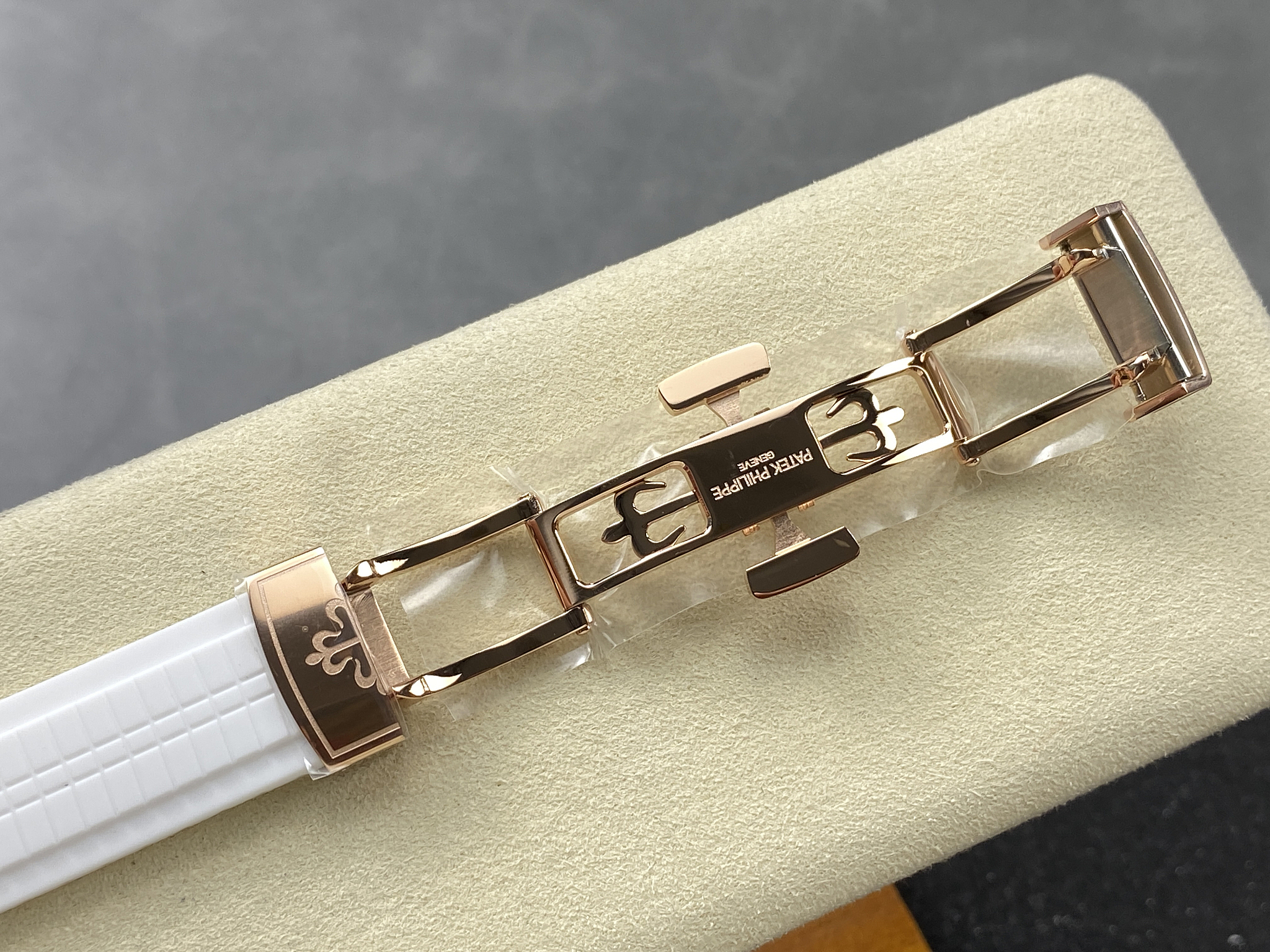 Rose-gold 5268R Luce originals with white dial trade above $55K. This replica delivers the same 38.8 mm diamond-set Aquanaut in rose gold with white chequerboard dial. Full