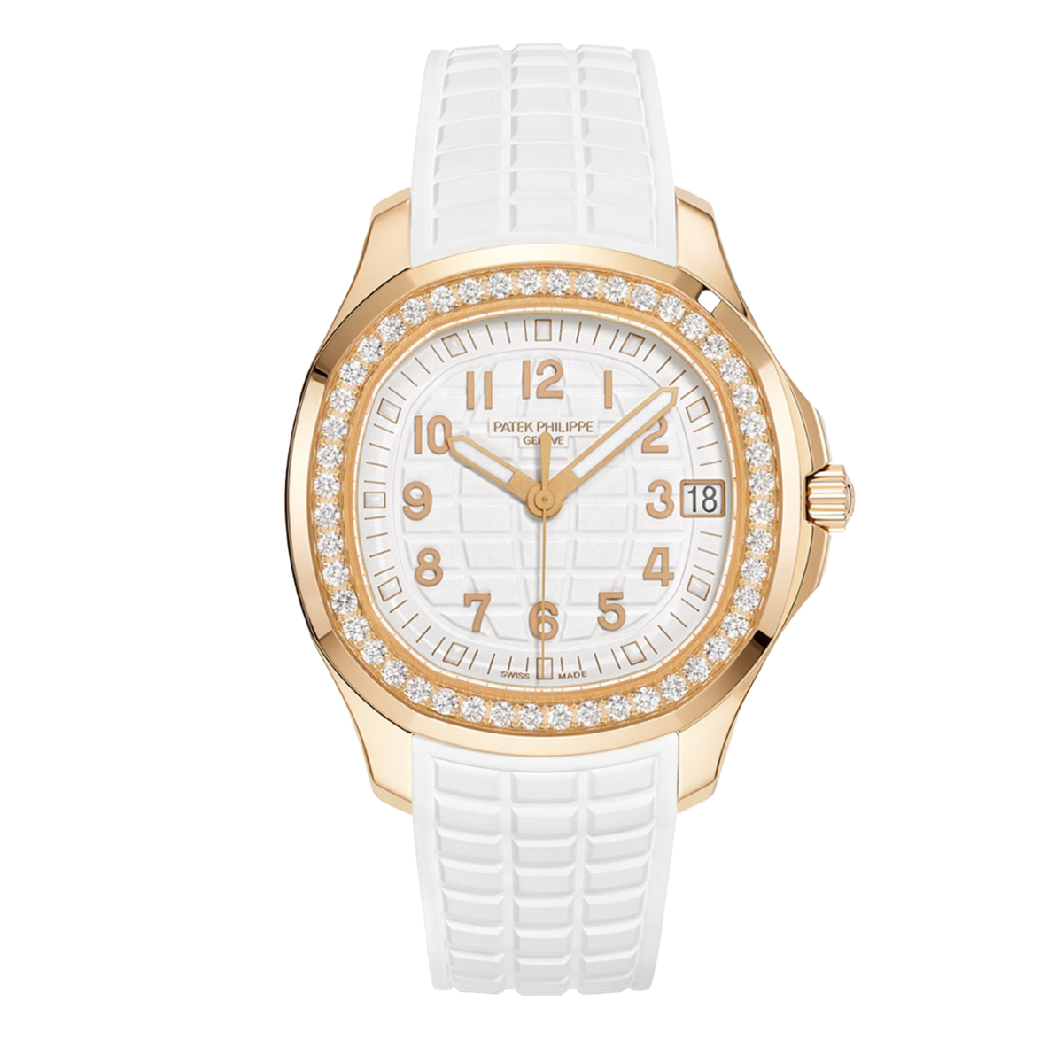 The 5268/200R-010 Luce with white dial on rose gold. Same 38.8 mm case and forty-six-diamond bezel as the taupe-dial variant, but the white dial inverts the colour hierarchy. The taupe version blends into the warm rose-gold surround; the white version creates contrast — bright face against warm frame. Applied rose-gold-tone Arabic numerals stand out clearly against the white chequerboard base. This is the highest-contrast rose-gold Luce configuration available. This replica Patek Philippe Aquanaut Luce is built in rose gold: case, diamond bezel, crown, clasp.