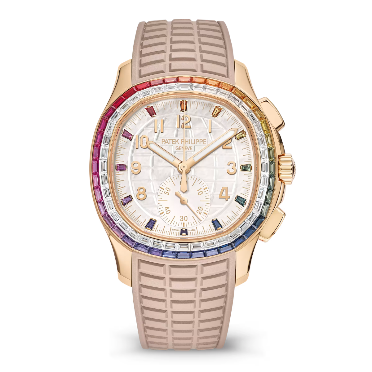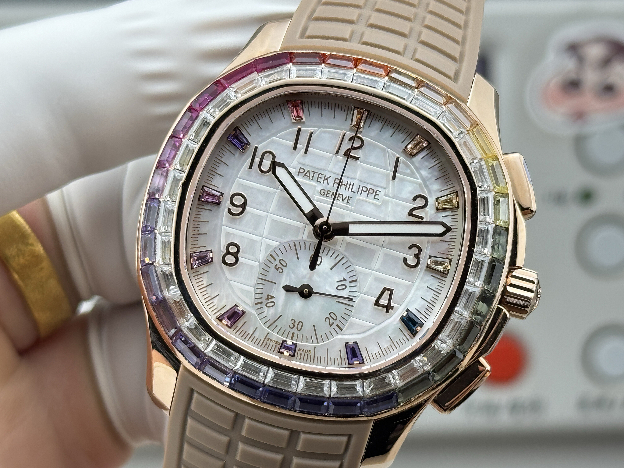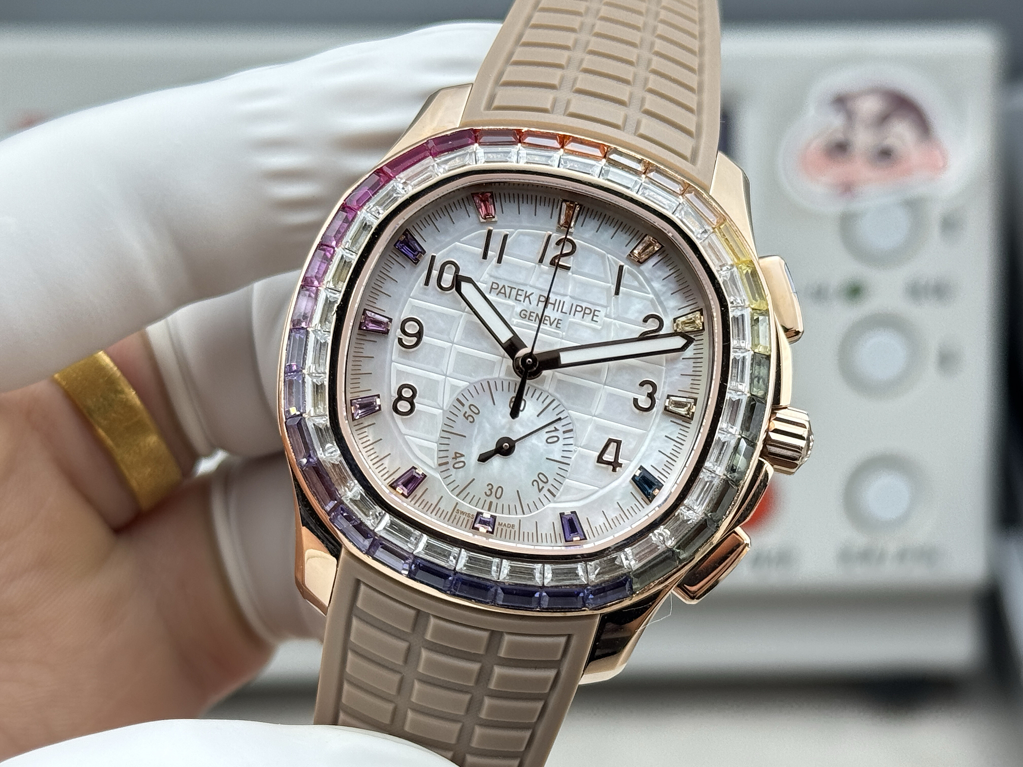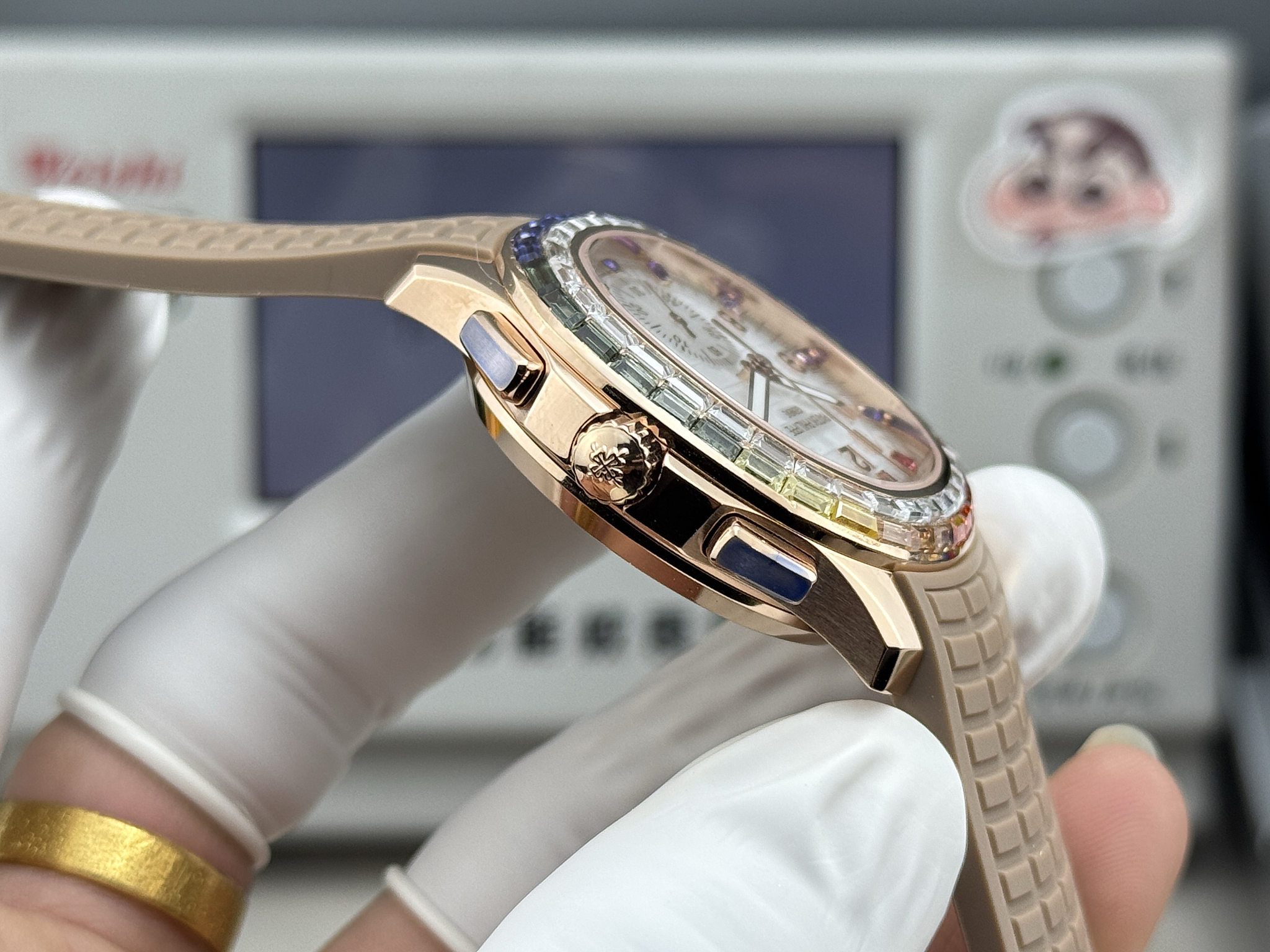 The 7968/300R represents the pinnacle of the Aquanaut Luce range — rainbow sapphires, annual calendar, and rose gold in a single reference. This replica delivers the complete package. Full Aquanaut collection | Contact us