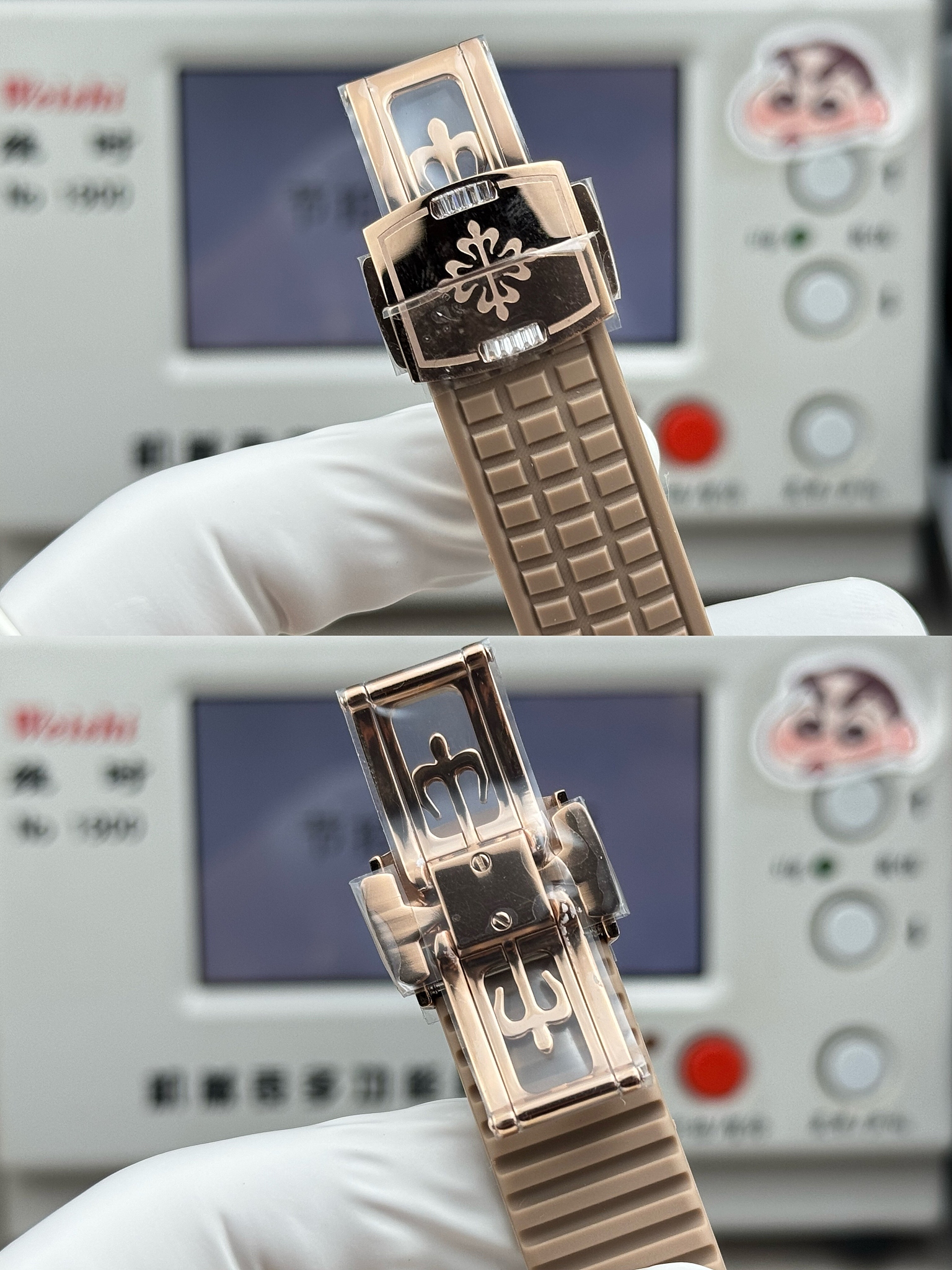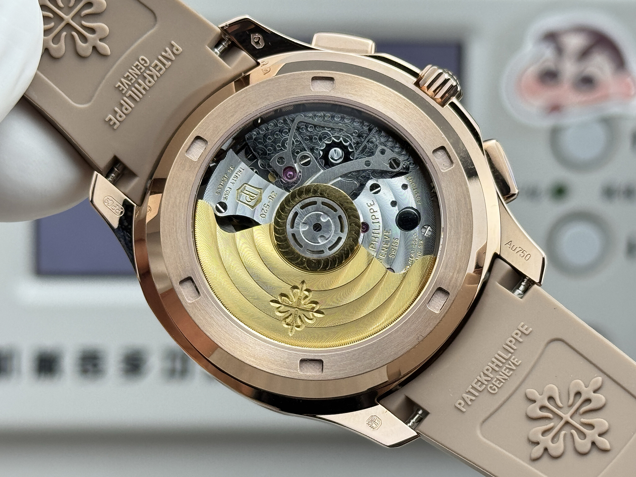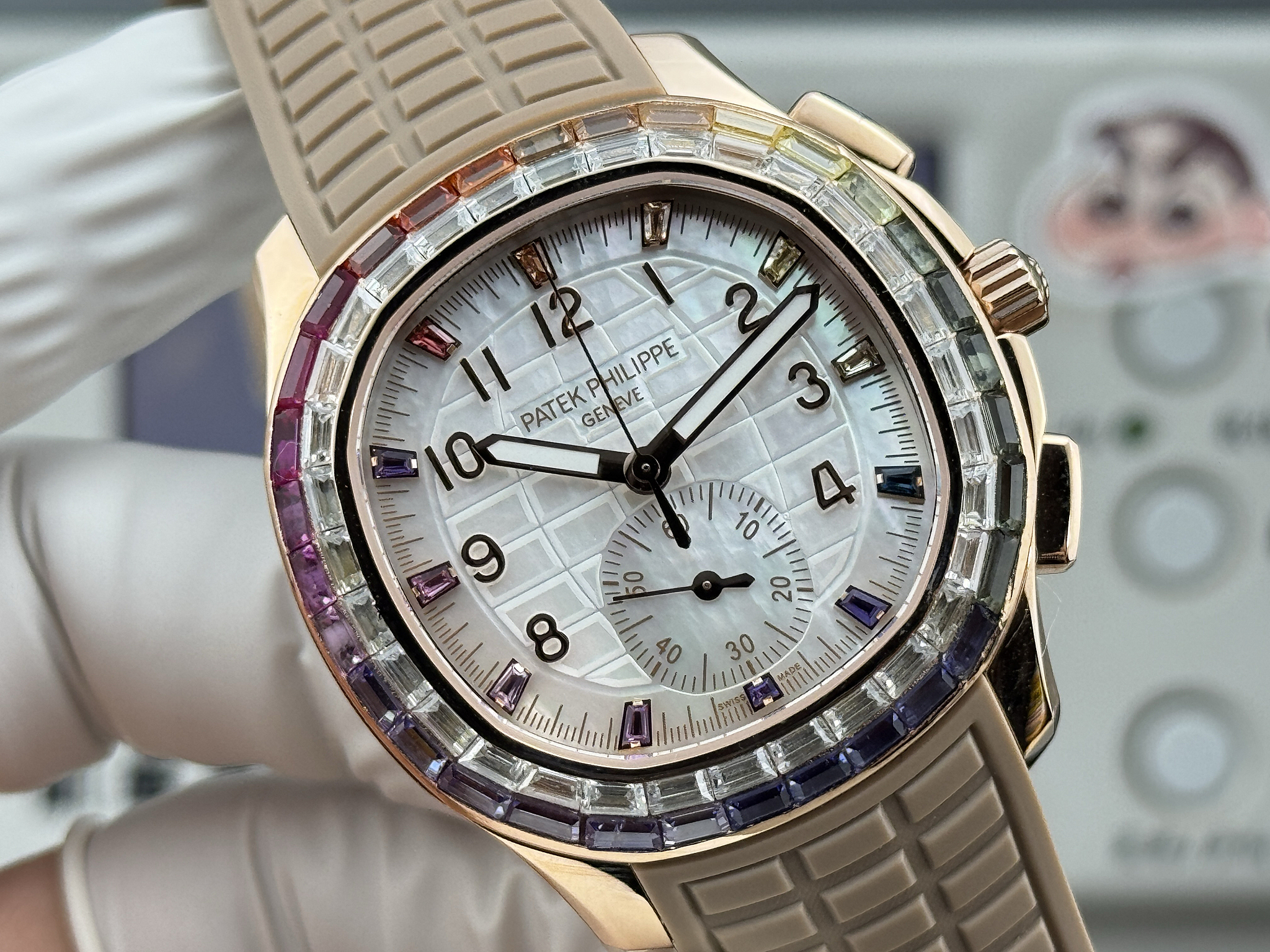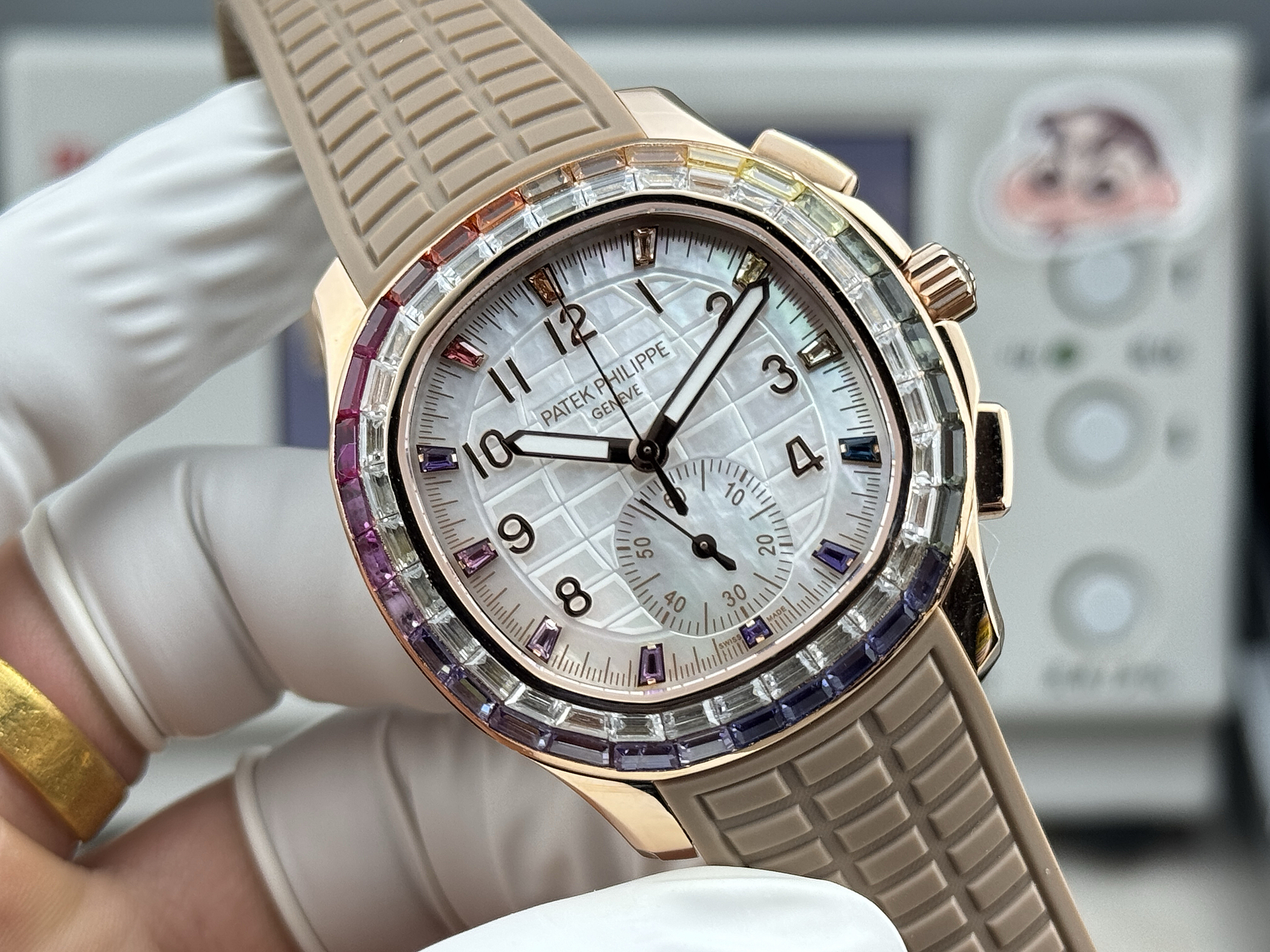 The 7968/300R represents the pinnacle of the Aquanaut Luce range — rainbow sapphires, annual calendar, and rose gold in a single reference. This replica delivers the complete package. Full Aquanaut collection | Contact us