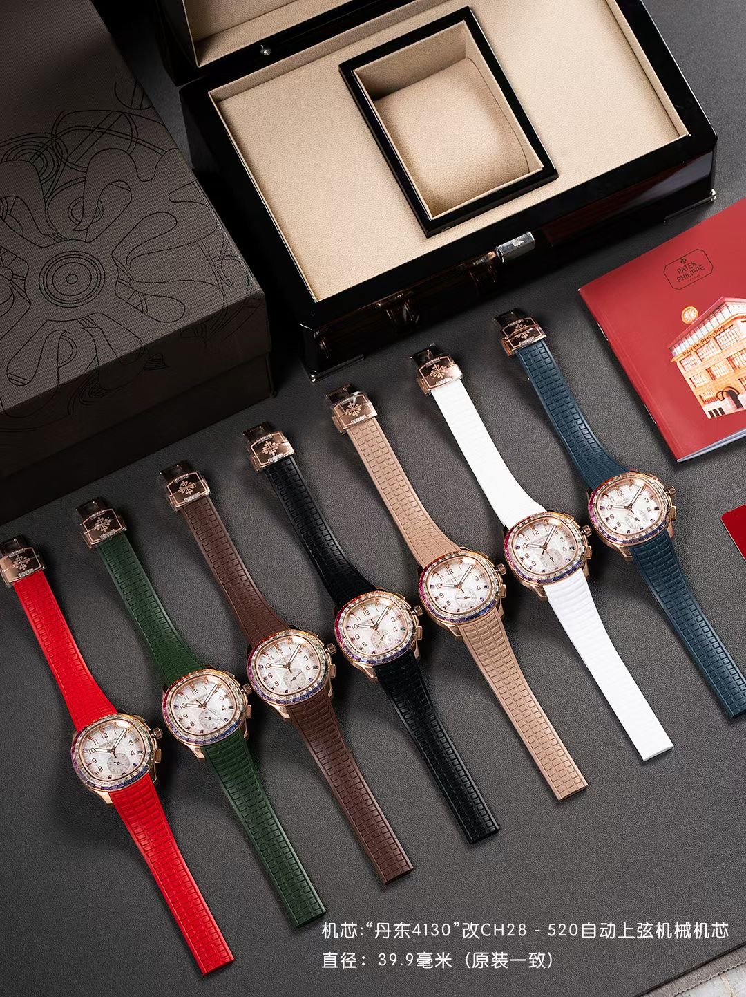 The 7968/300R is the rainbow-set edition of the Aquanaut Luce line. A graduated spectrum of coloured sapphires circles the rose gold bezel — a technique Patek Philippe applies sparingly, reserved for the highest-tier Luce references. The 39.9 mm case houses the annual calendar complication with moon phase, making this one of the most complicated Aquanaut Luce models in the collection. This replica Patek Philippe Aquanaut Luce Rainbow delivers the full visual impact of the gemstone bezel against the blue-gray embossed dial.