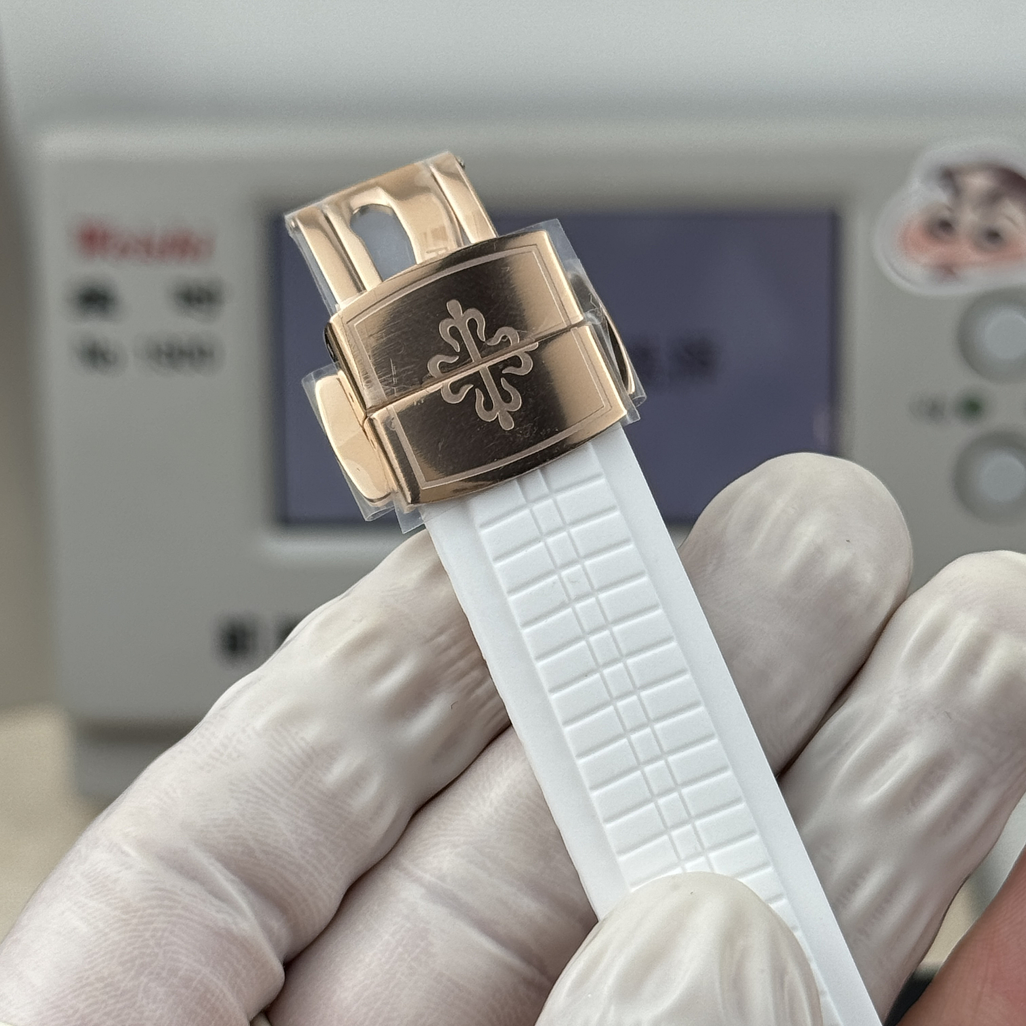 White composite strap with rose-gold-tone deployment clasp. Chequerboard-molded surface. The white-on-rose-gold palette runs lighter than the taupe 5268/200R option. The
