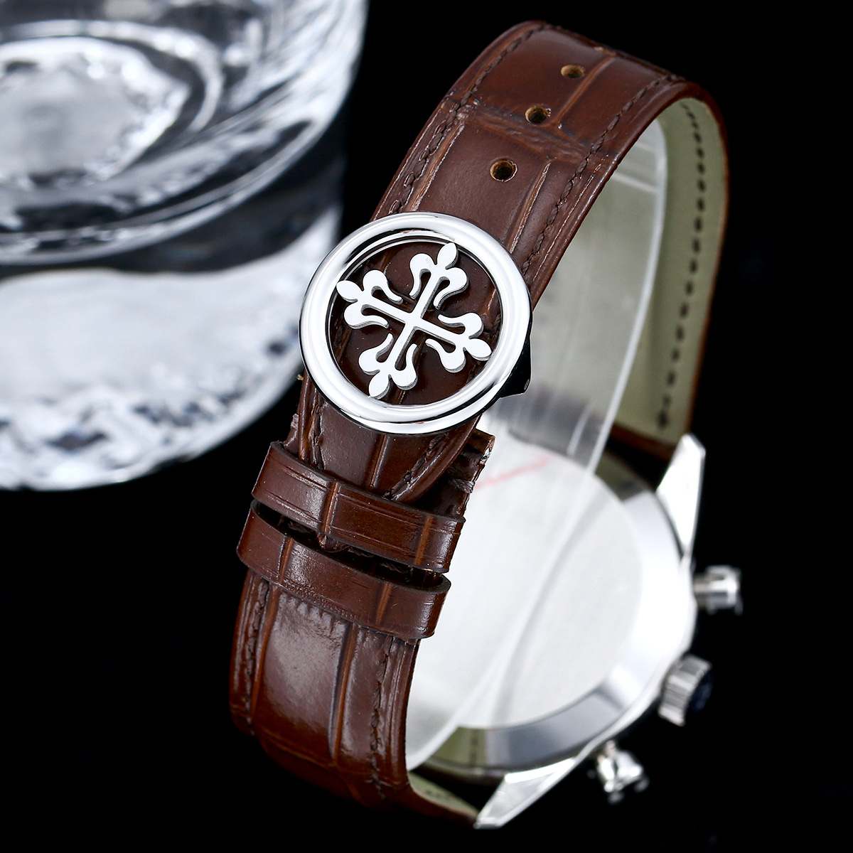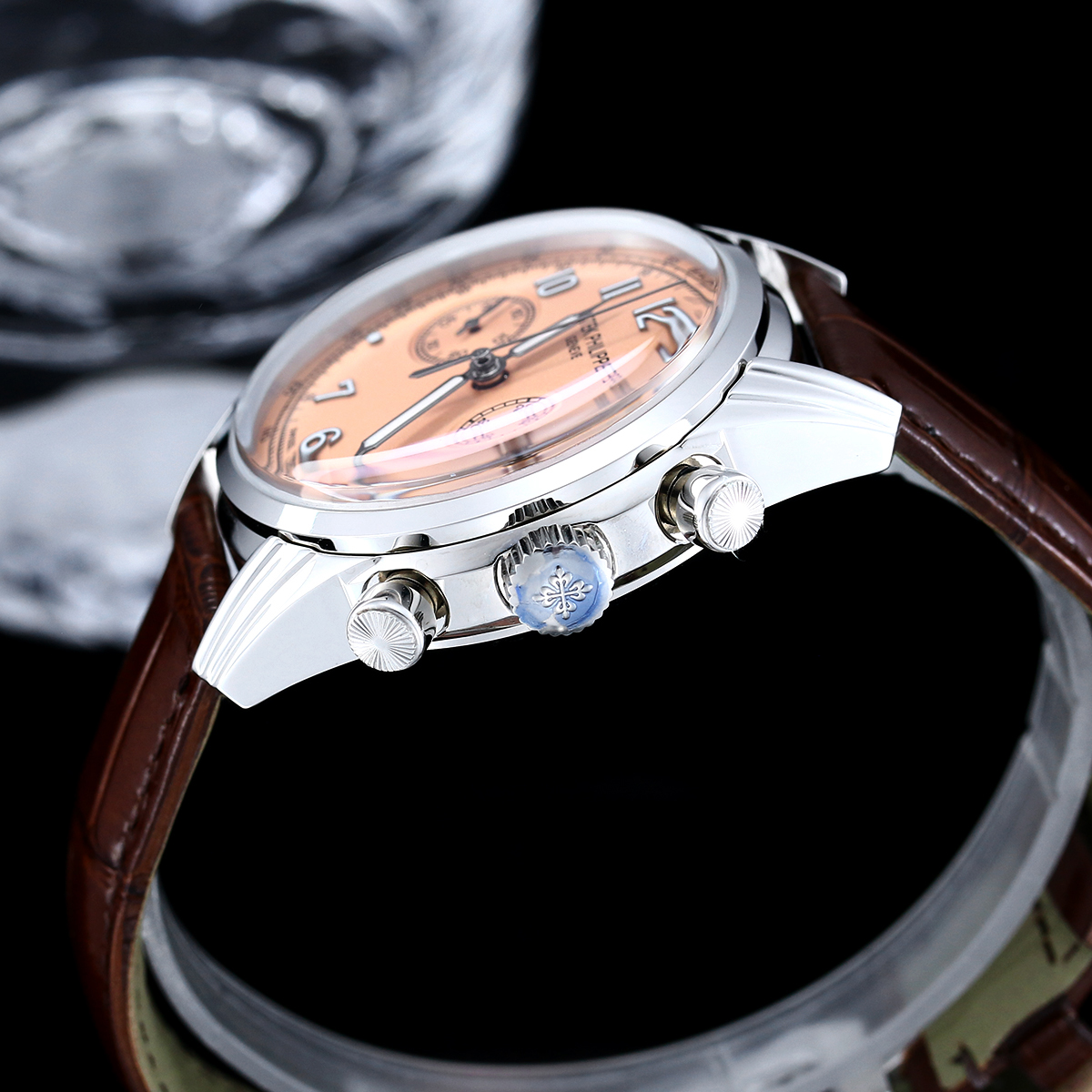 41 mm white gold case — the manually-wound movement allows a slimmer case profile than the automatic 5905 chronographs. No rotor weight on the wrist, no rotor noise. The daily winding ritual creates a connection with the watch. The Calatrava-derived case shape with pump pushers references vintage chronograph design. Leather strap with white gold buckle. Sapphire case back shows the column wheel and chronograph levers. A men’s chronograph for purists.