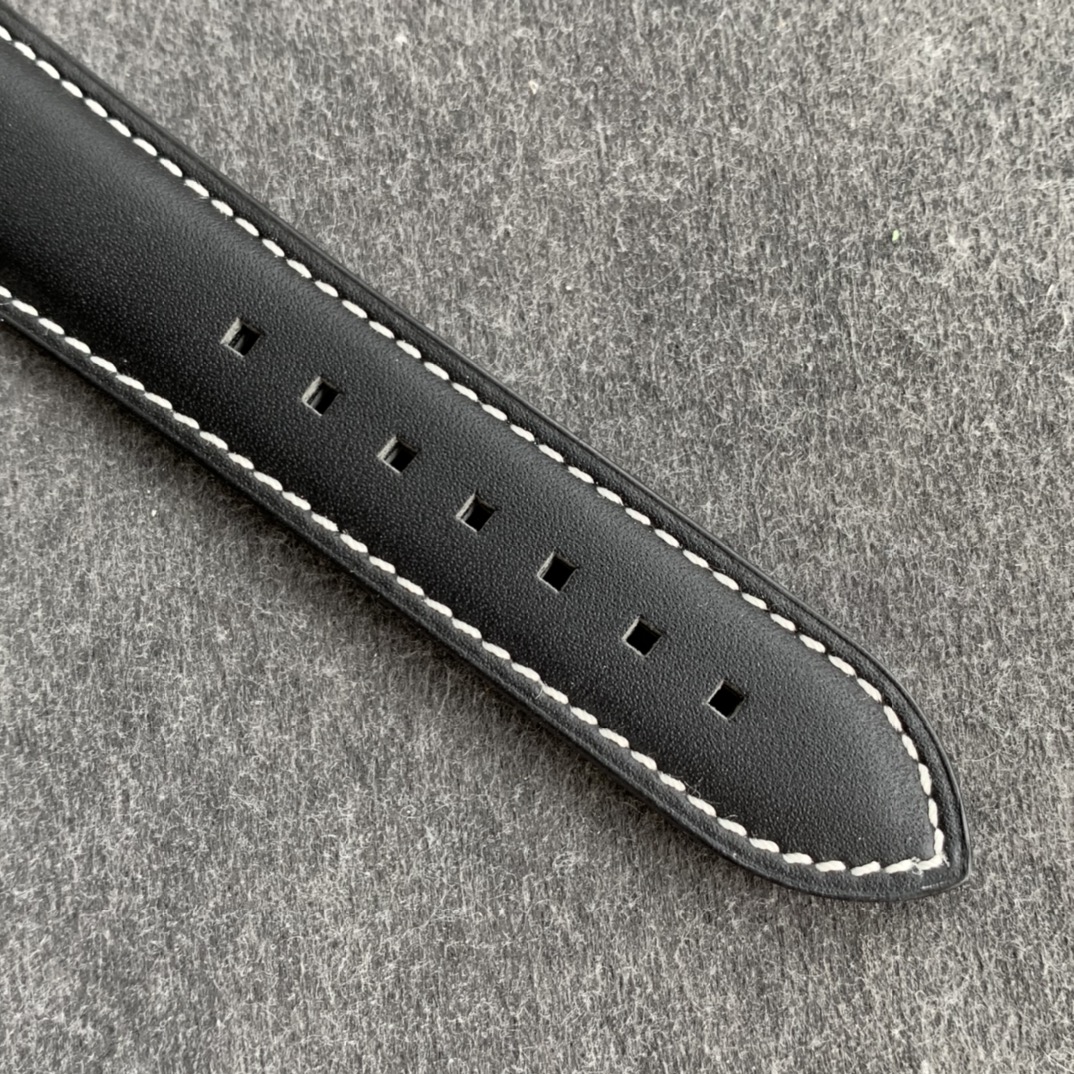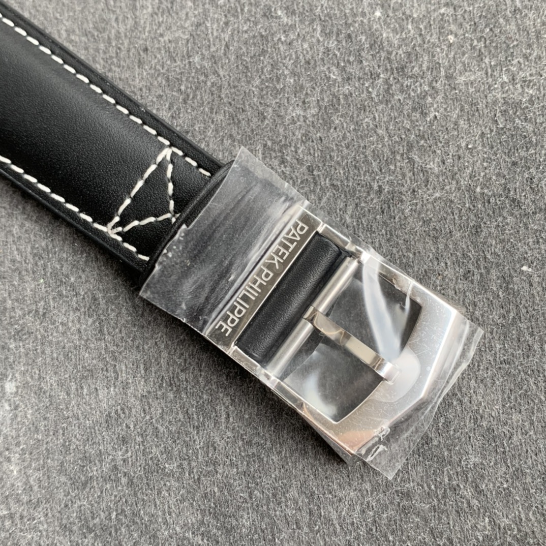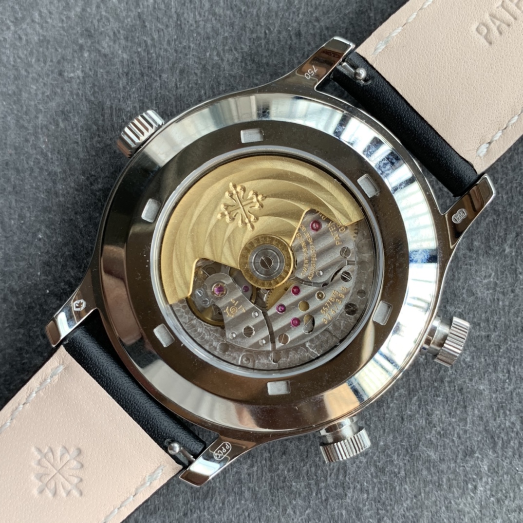 Leather strap with white gold clasp. The calfskin strap references vintage pilot watch straps while maintaining Patek’s finishing standards.