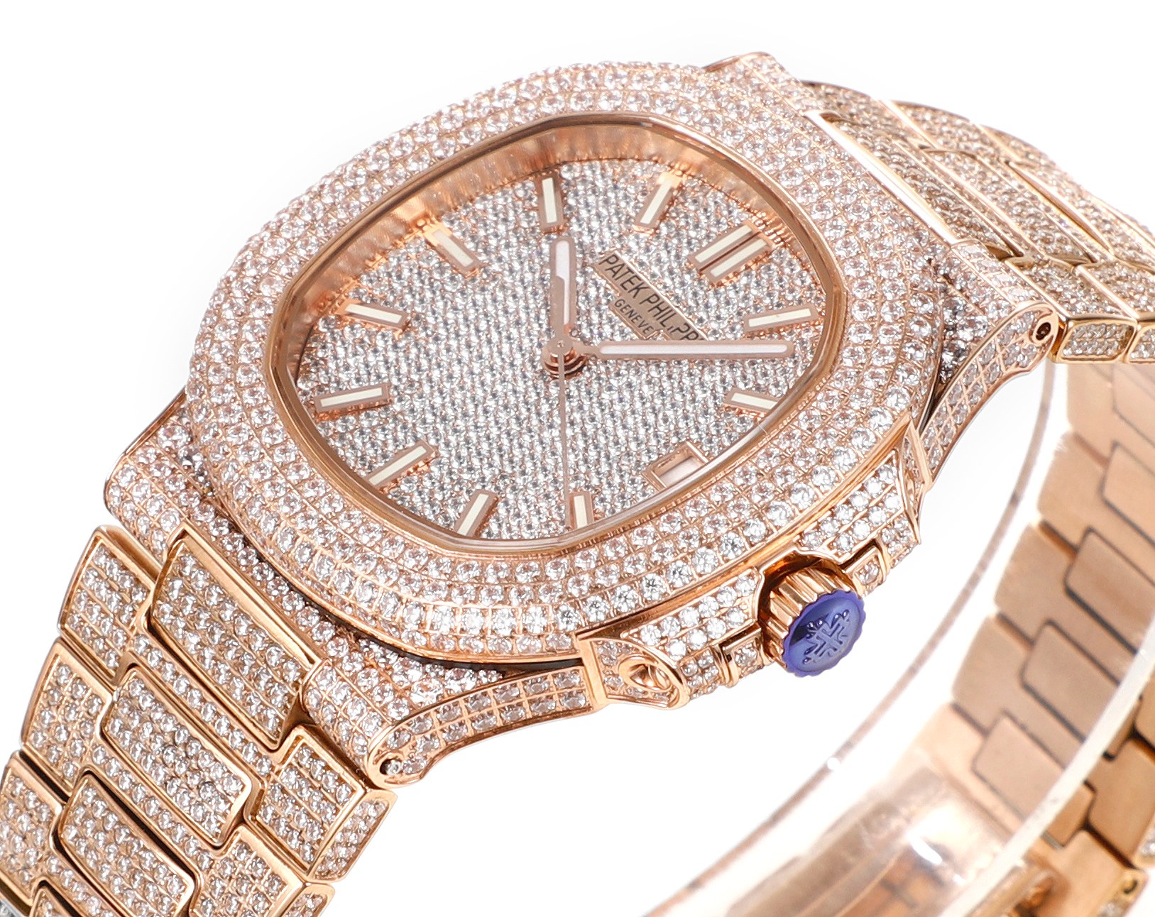 This replica delivers the rose-gold iced-out Nautilus 5711 with diamond-paved dial. Full