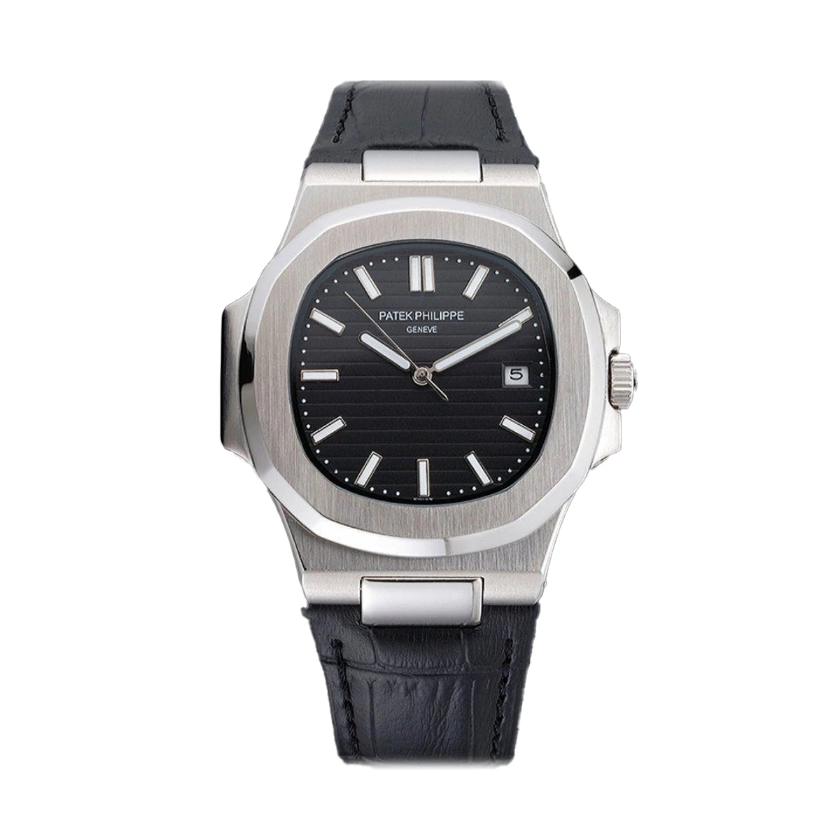 White gold 5711G references were produced in much smaller numbers than steel. On the secondary market they sit between the steel 5711/1A and the rose gold 5711/1R in value. This 5711G replica puts the black-dial white gold Nautilus on your wrist — 40 mm, crocodile strap, no-date-window simplicity. Browse the