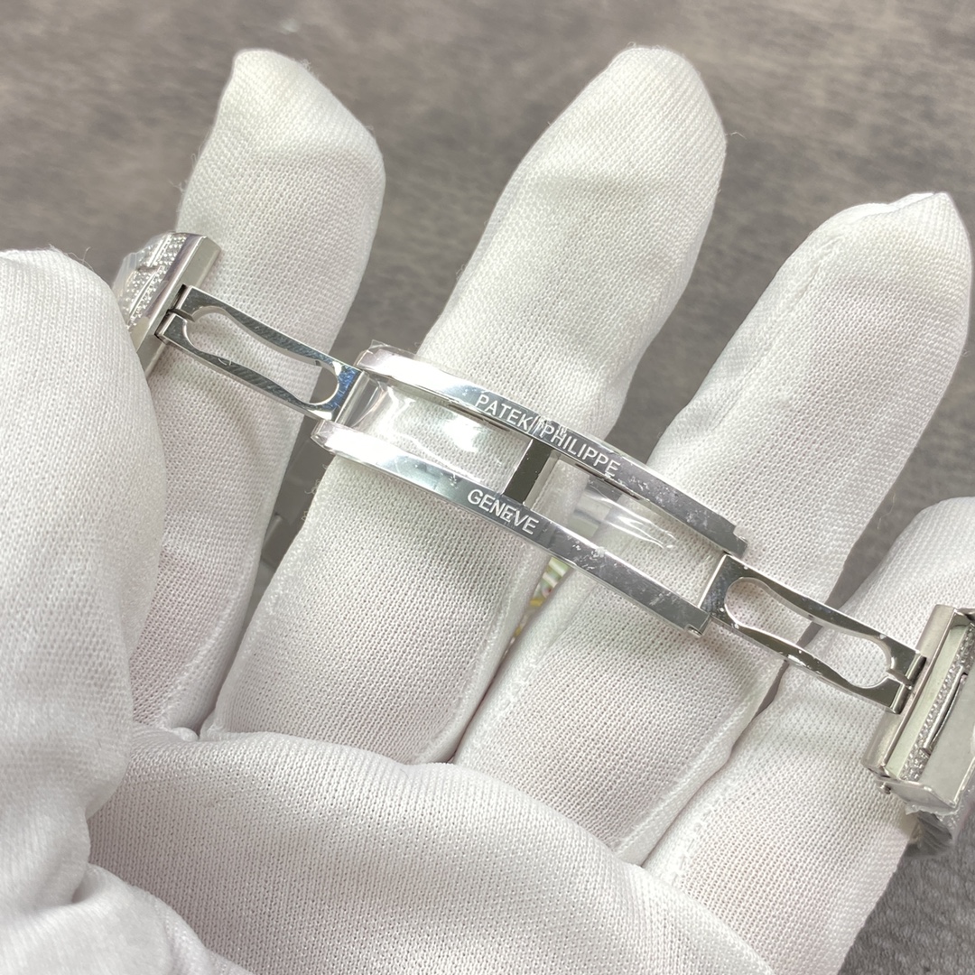 Integrated white-gold-tone 904L steel. Centre links fully paved with colourless CZ; outer links in satin-brushed white-gold tone. The diamond channel runs from bezel through bracelet without interruption. Fold-over deployment clasp. The all-white paving makes this the iciest piece in the Nautilus collection.