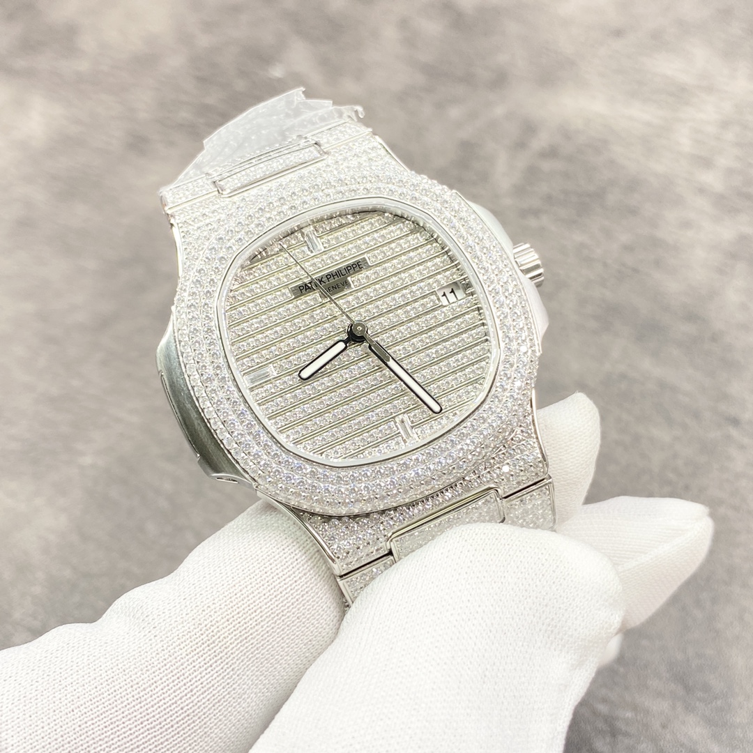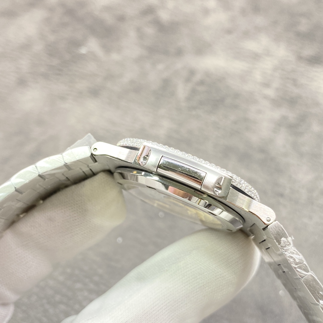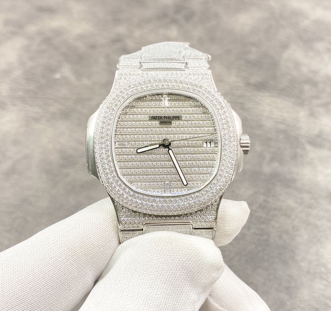 White-diamond 5719/10G originals exceed $300K at auction. This replica Nautilus 5719 delivers the standard white-diamond fully paved configuration. Full Nautilus collection | Contact us
