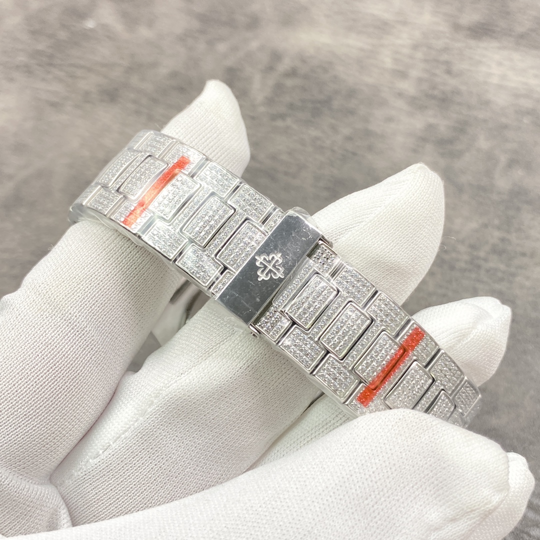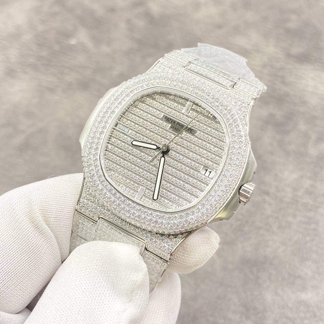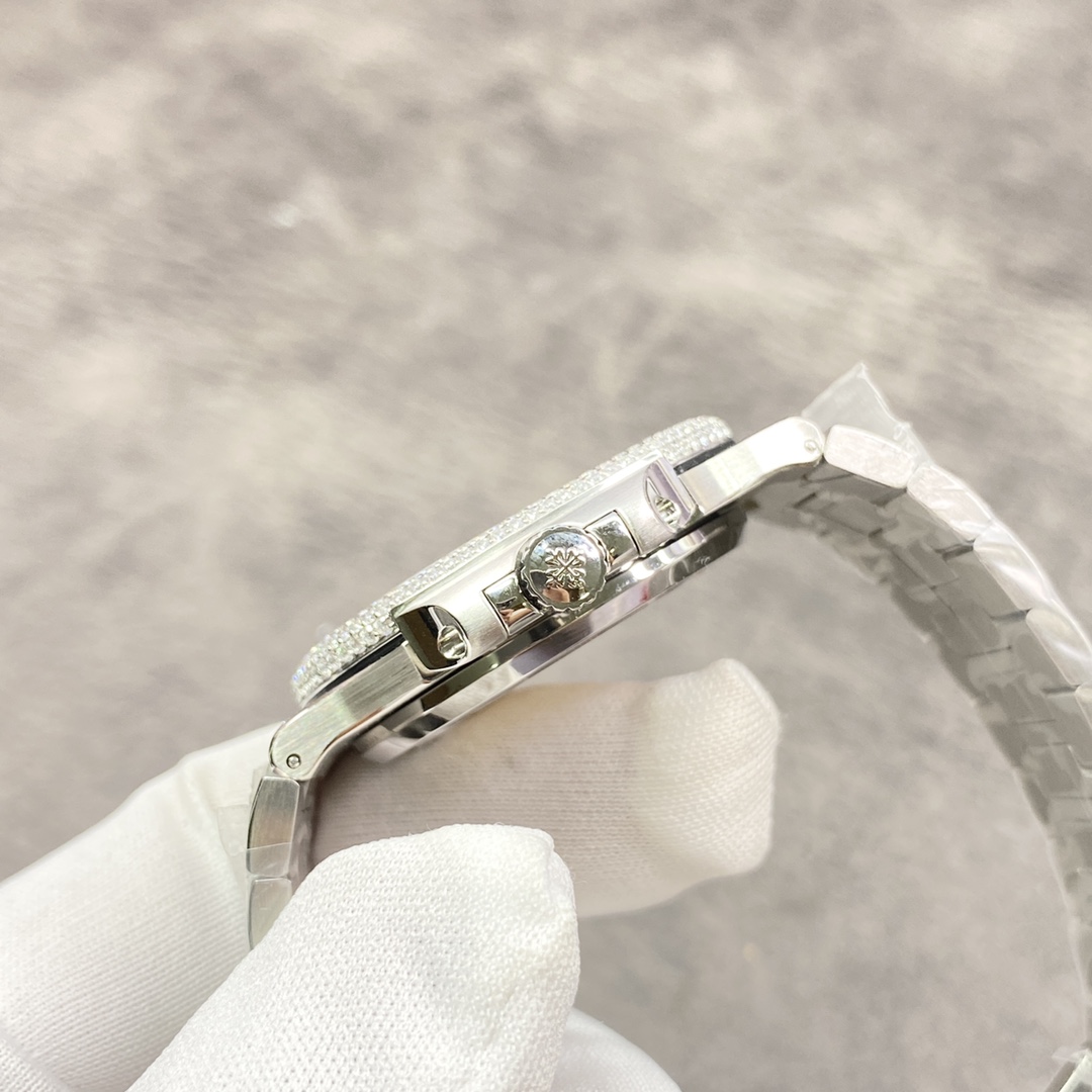 White-diamond 5719/10G originals exceed $300K at auction. This replica Nautilus 5719 delivers the standard white-diamond fully paved configuration. Full Nautilus collection | Contact us
