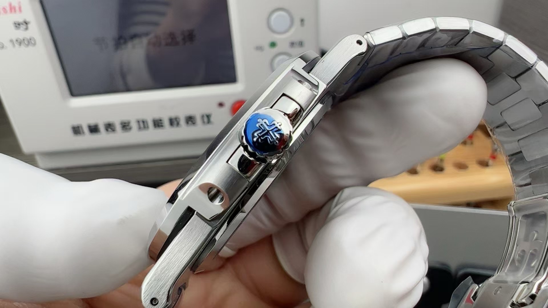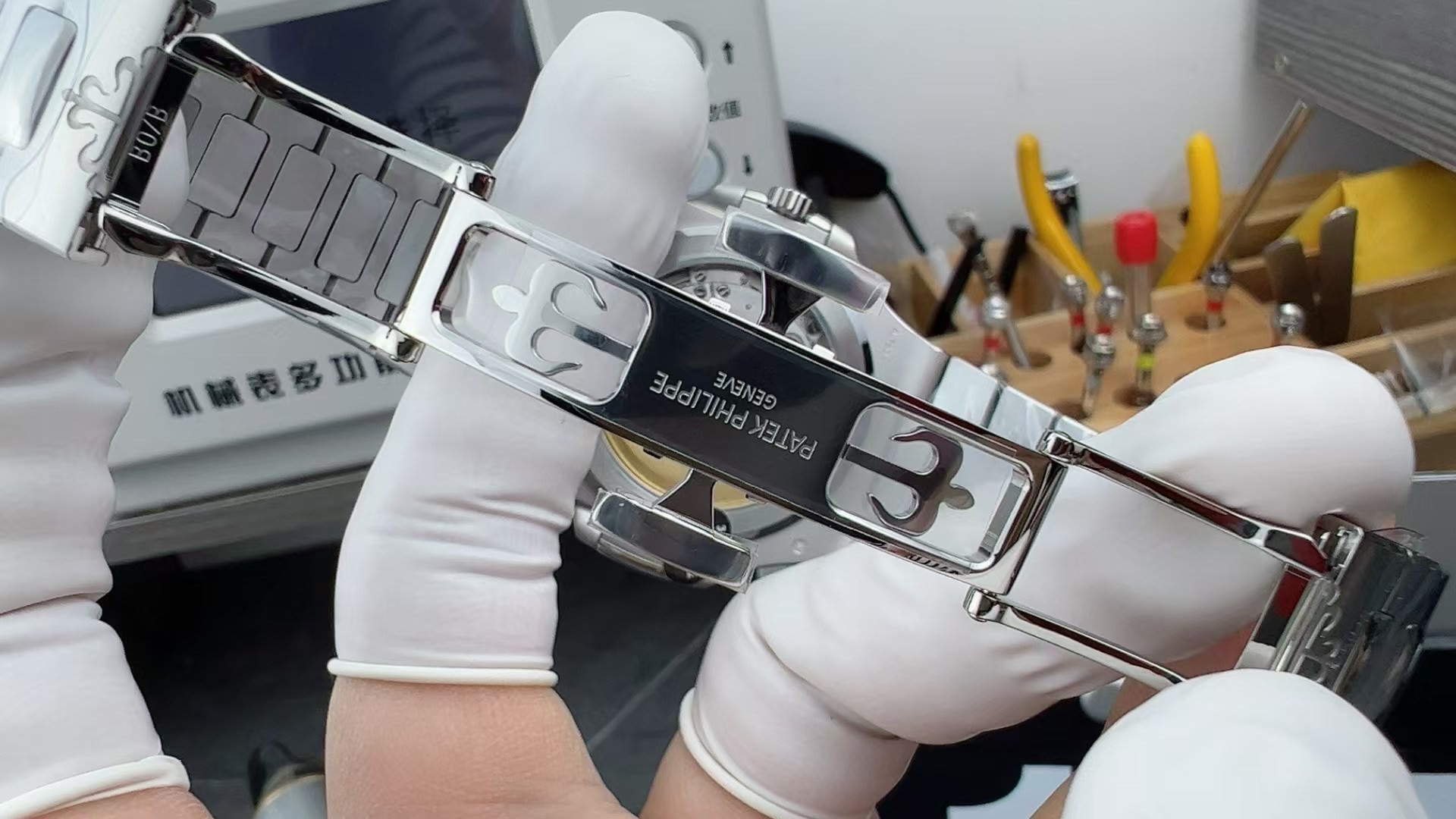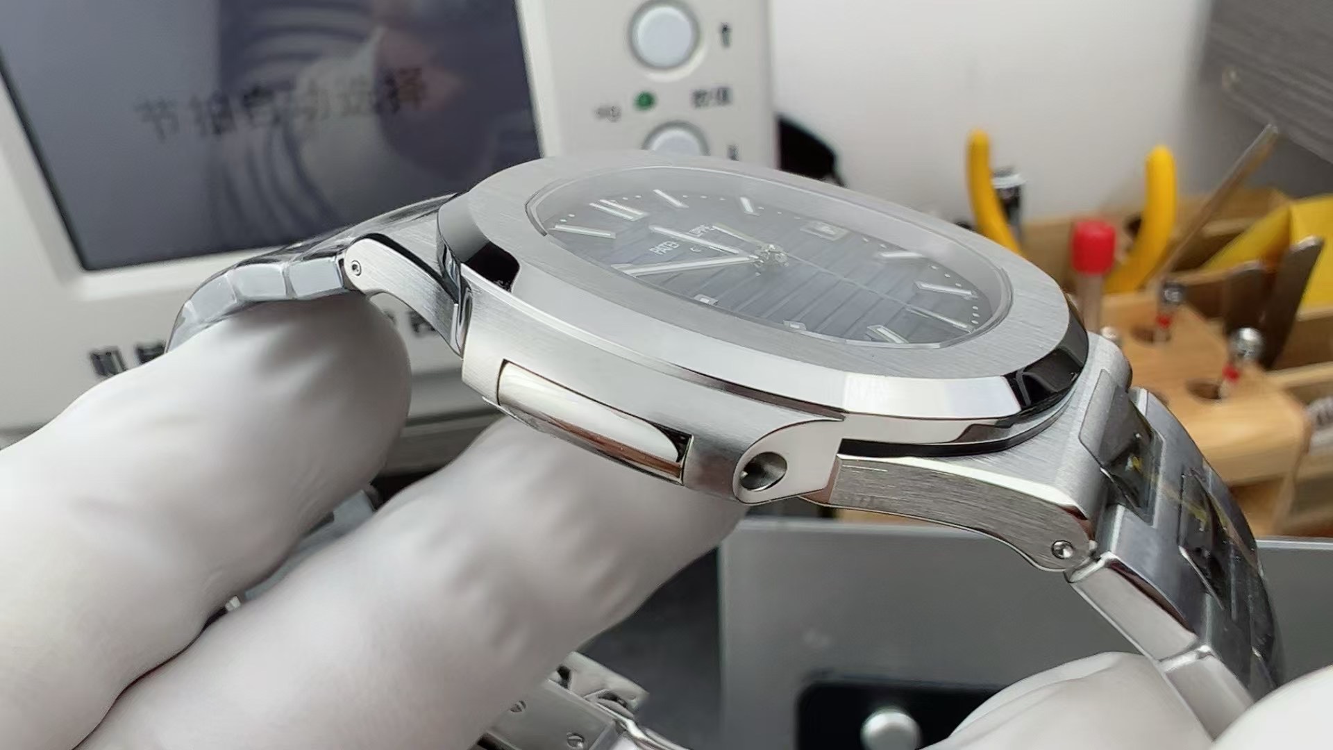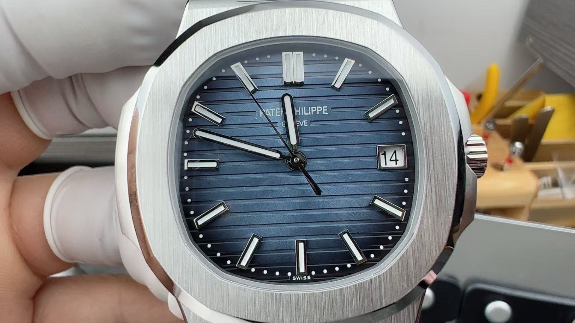 White-gold 5811/1G-001 originals have a retail around $40K with secondary market premiums pushing them higher. This Nautilus 5811 replica is the same 41 mm next-generation sport watch with the black-gradient dial rim. Full