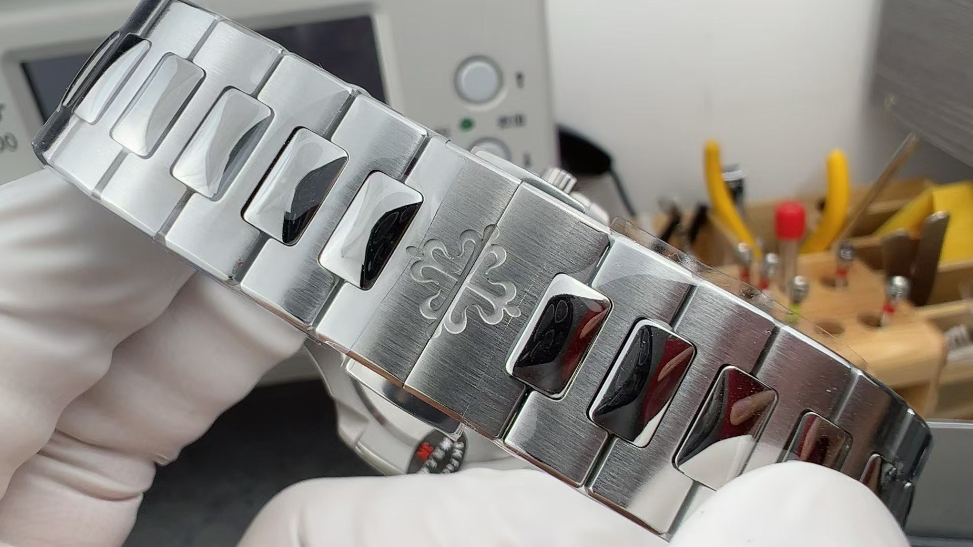 Integrated white-gold-tone 904L steel, flush mount. Redesigned link shape compared to the 5711 — slightly wider centre links, refined clasp mechanism. Alternating satin and polished surfaces. Sits closer in feel to the