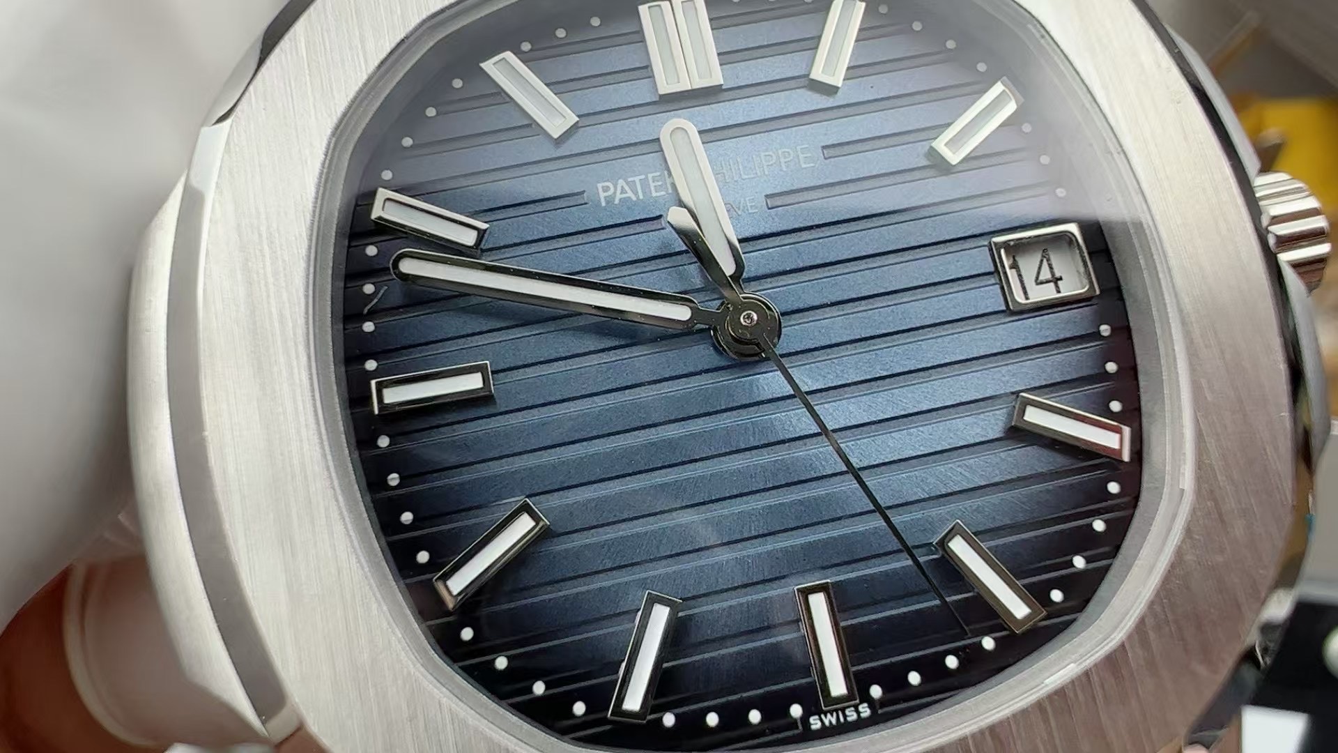 Blue sunburst dial with horizontal embossed grooves and a black-gradient rim — the key visual difference from the 5711. Colour darkens toward the outer edge, creating depth the flat-blue 5711 dial did not have. Applied white-gold baton markers, luminous fill. Date at 3, white disc. Dauphine hands, seconds hand with no tail.