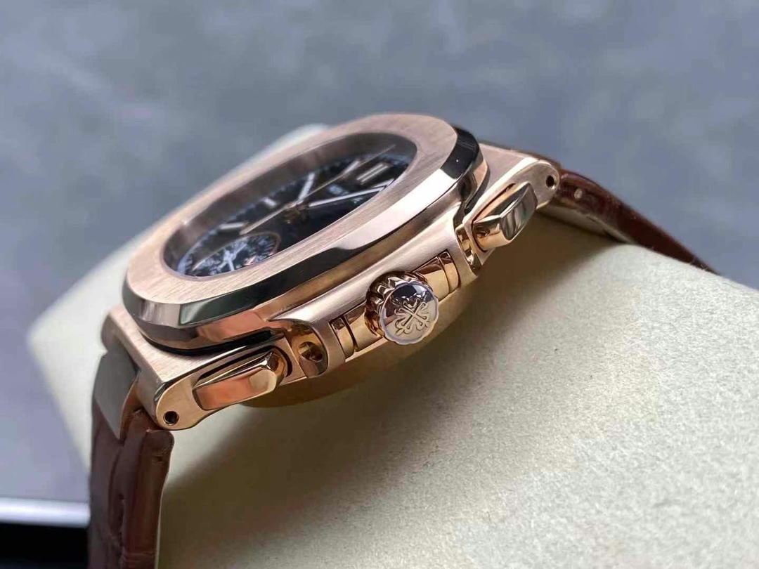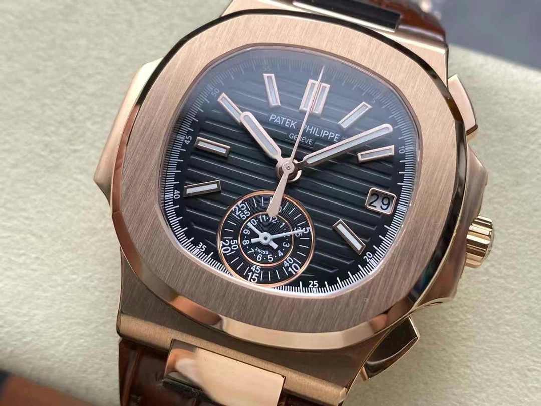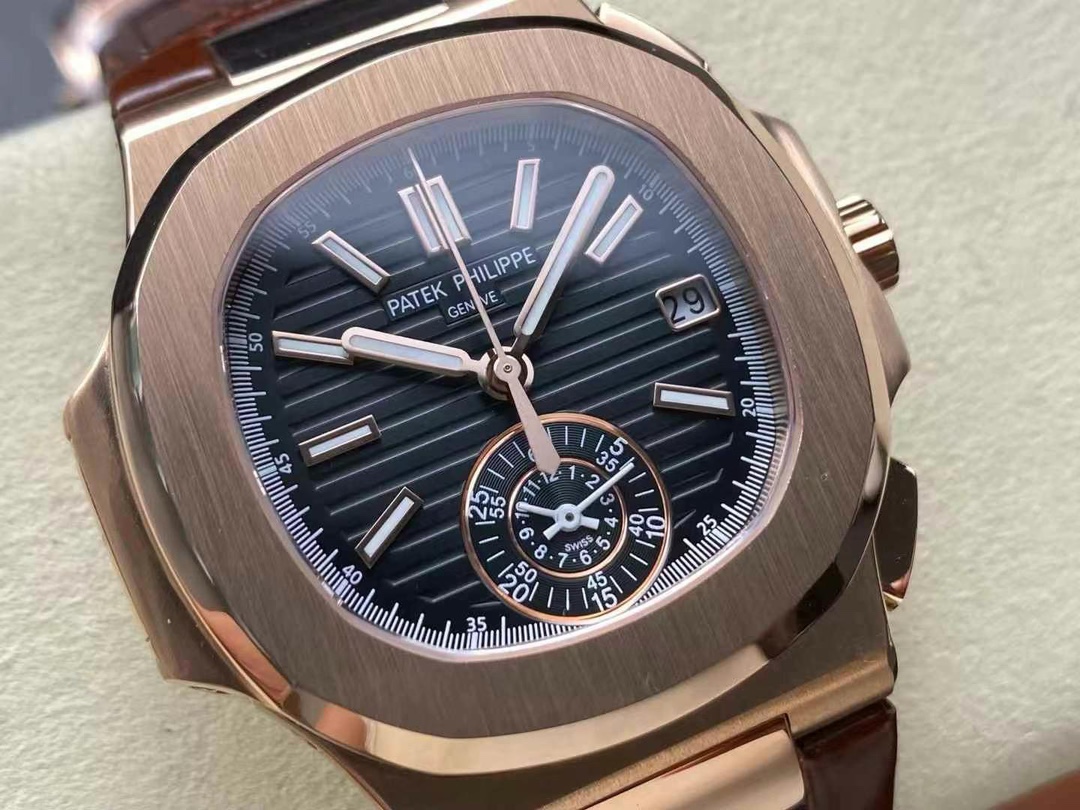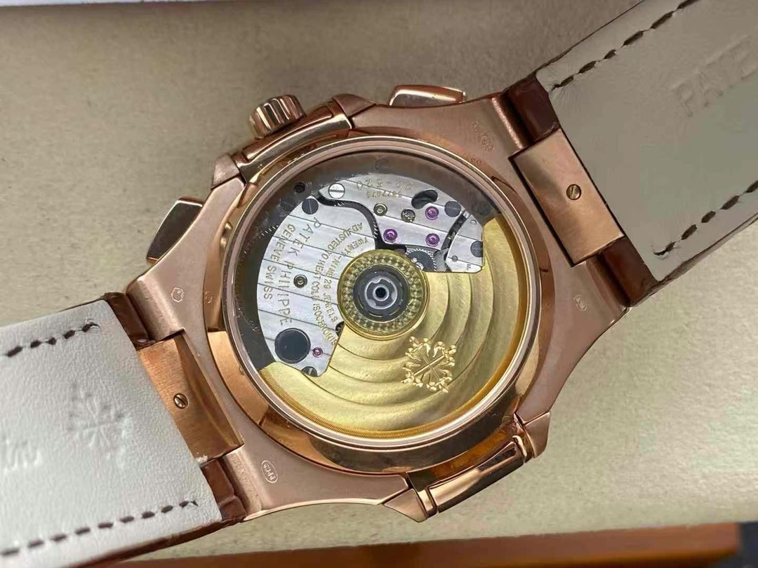 Rose-gold 5980R-001 originals trade above $90K. This Nautilus 5980 replica replicates the same 40.5 mm flyback layout — same two-subdial configuration, same case proportions, same pushers. Full