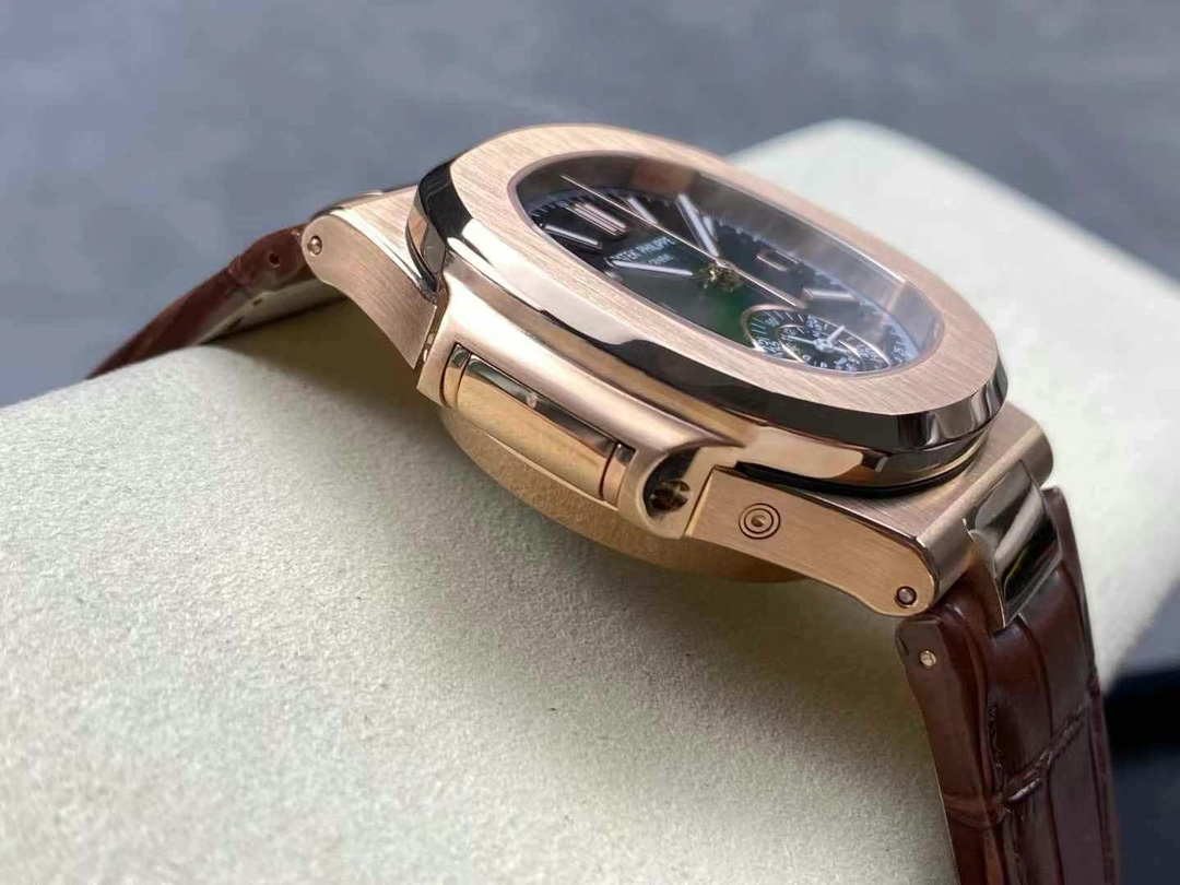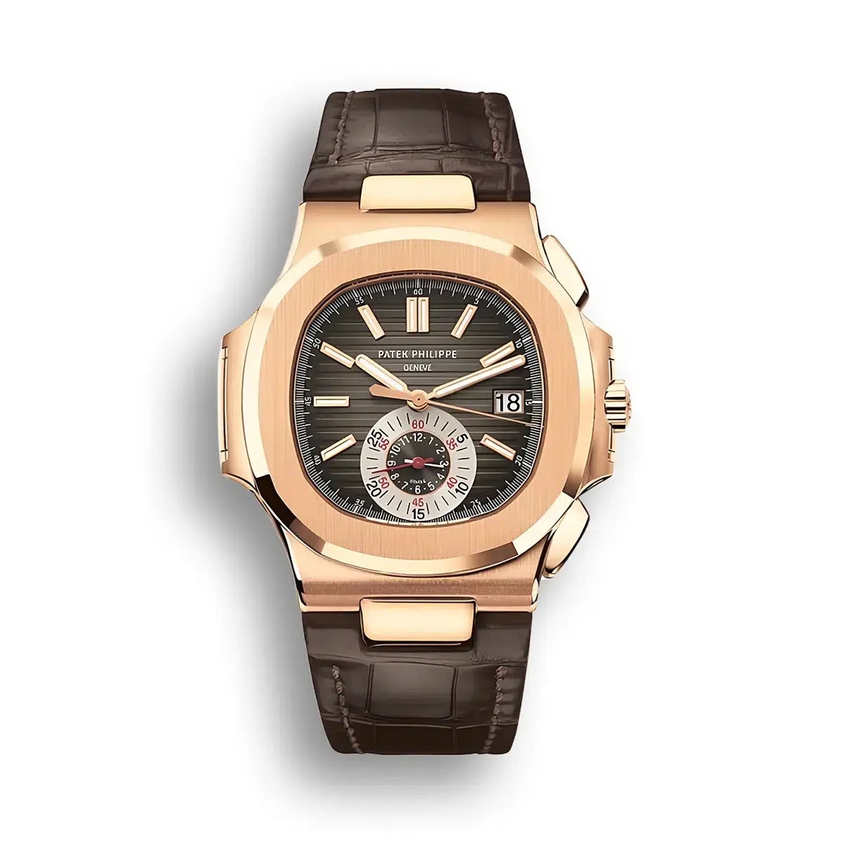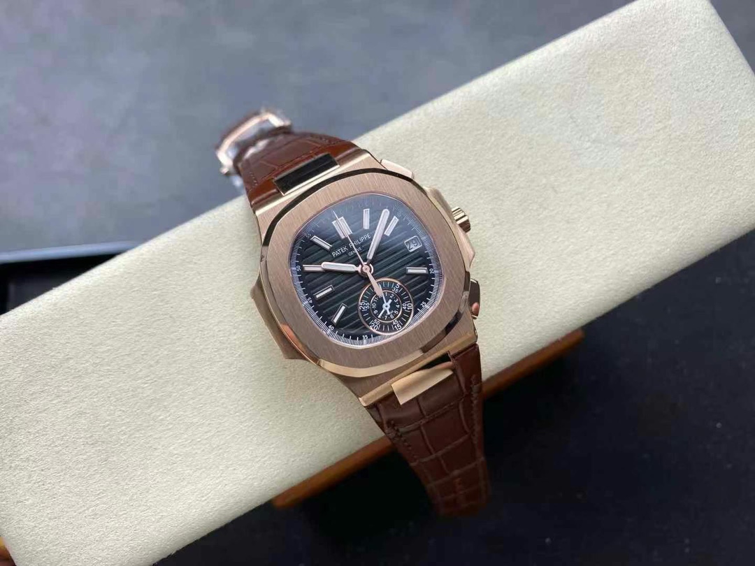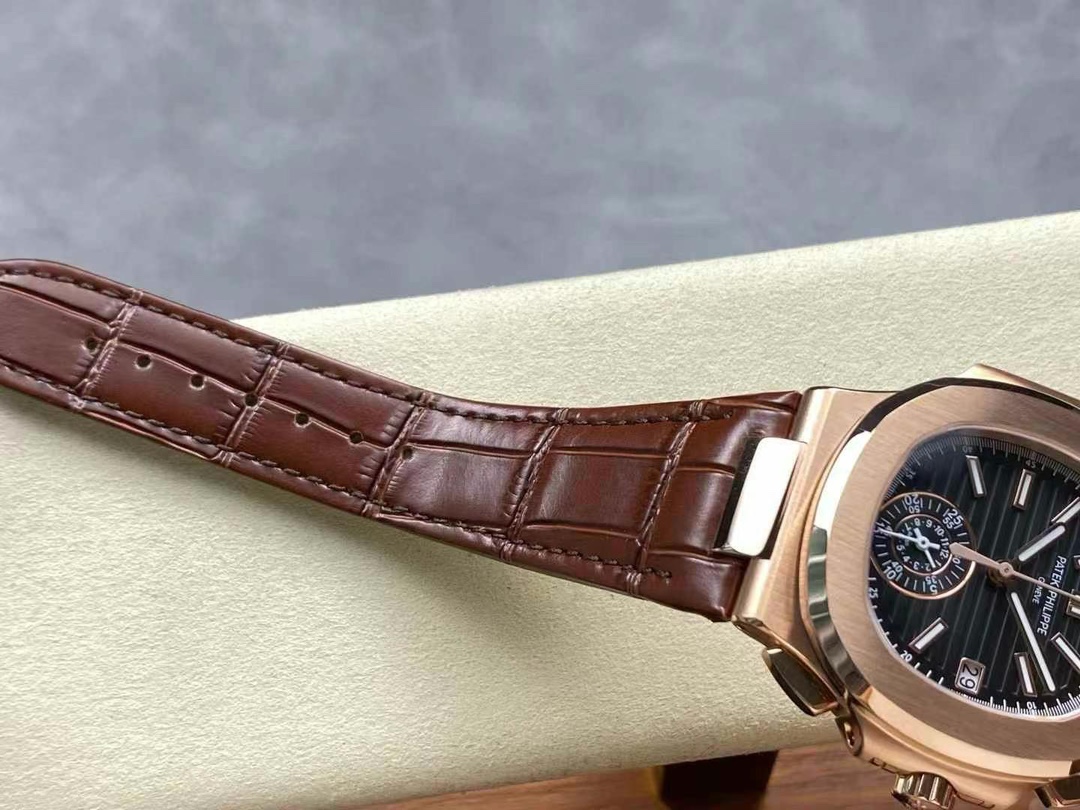 Rose-gold 5980R-001 originals trade above $90K. This Nautilus 5980 replica replicates the same 40.5 mm flyback layout — same two-subdial configuration, same case proportions, same pushers. Full