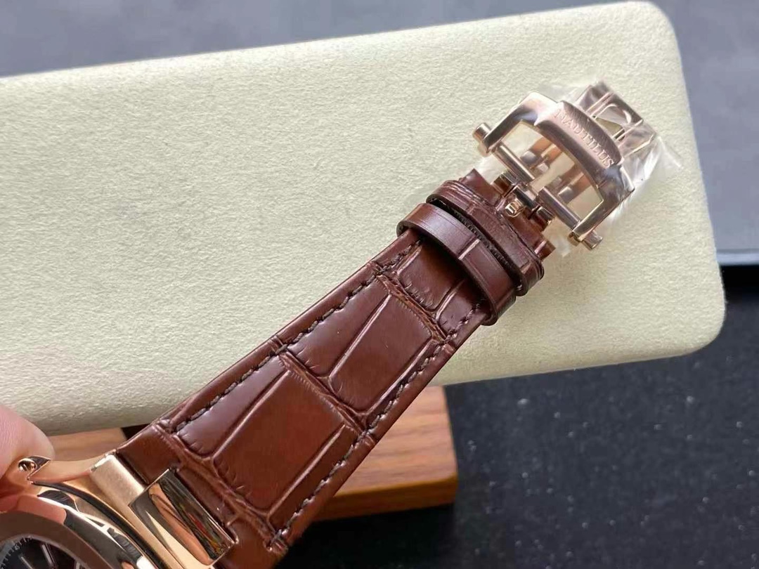 The 5980R-001 is the rose-gold Flyback Chronograph Nautilus on a leather strap — caliber CH 28-520 C FUS, flyback function, 60-minute counter at 6 o’clock. The “R” suffix means rose gold case on leather rather than an integrated bracelet. Patek Philippe introduced this reference as the formal option alongside the steel and two-tone variants. Thickest Nautilus in the range at 12.6 mm. This replica Nautilus 5980 carries rose-gold plating over 904L steel: case, bezel, pushers, and buckle.