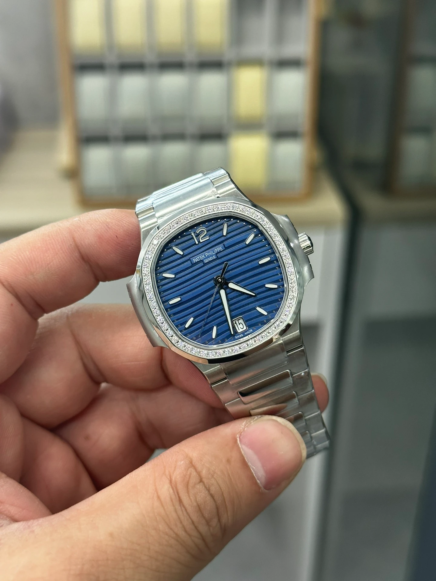 Blue opaline dial with horizontal embossed finish — identical to the plain-bezel 7118/1A-001. The diamond bezel adds sparkle that refracts across the dial surface in direct light, something the plain brushed bezel cannot do. Applied baton markers, diamond at 12, date at 3. Dauphine hands.